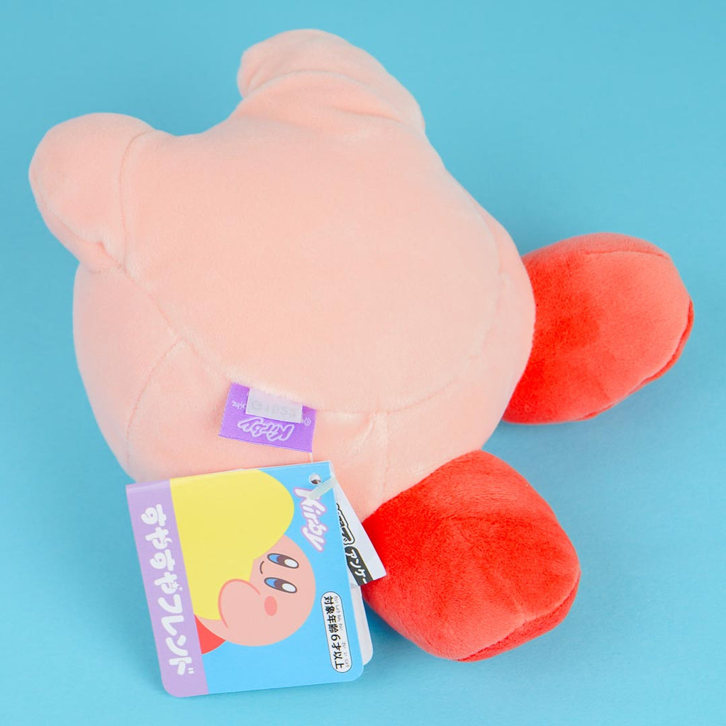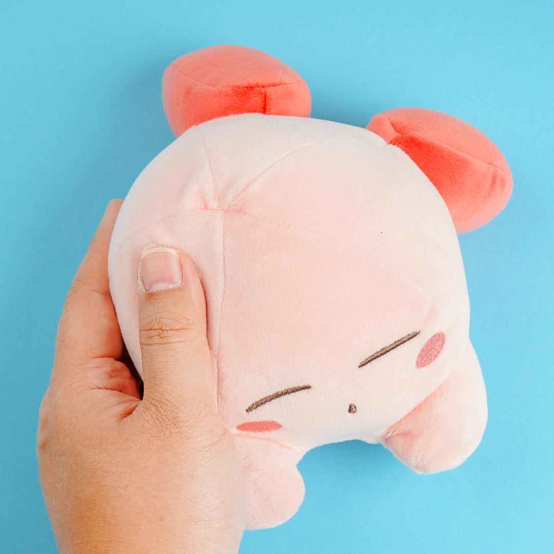 This cute and fluffy Kirby plushie is in a sleeping pose. It's a medium-sized stuffed toy that's made from soft and squishy material so it's a perfect snuggle buddy!