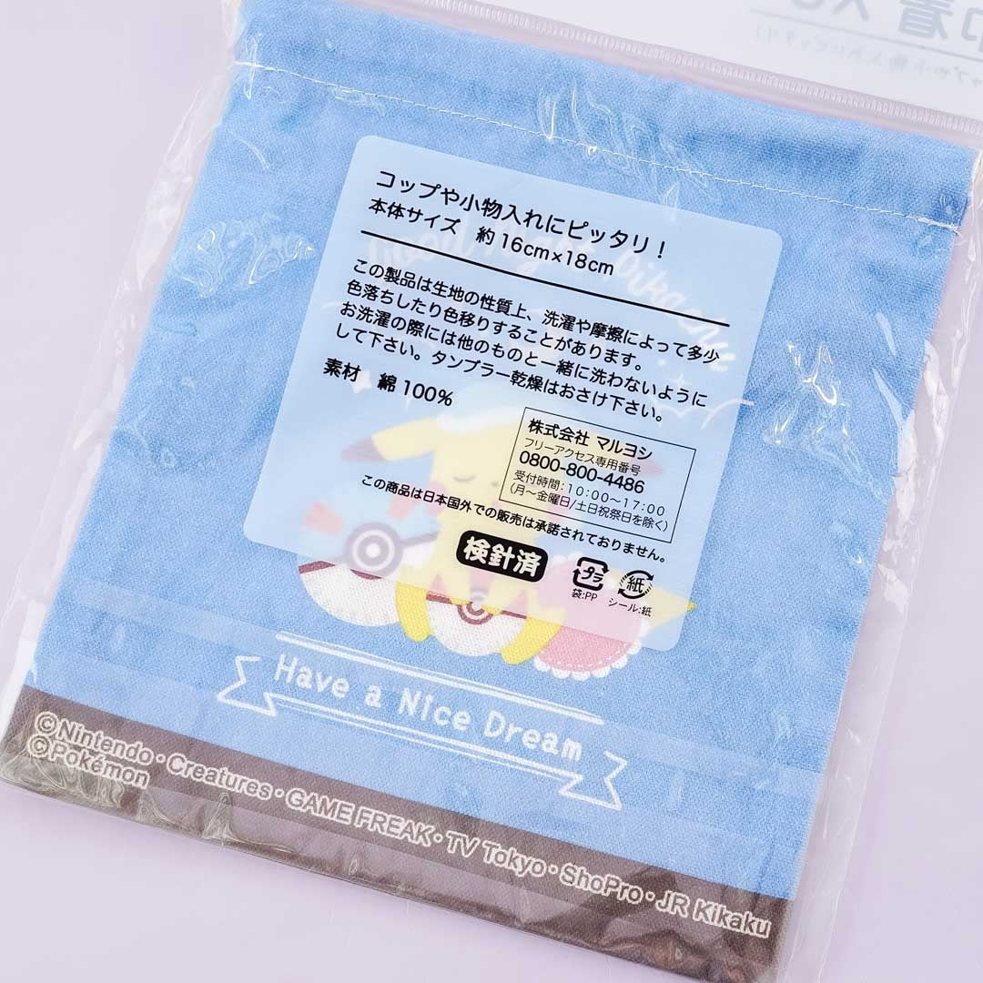 A kawaii drawstring pouch illustrated with Pikachu carrying a stick
