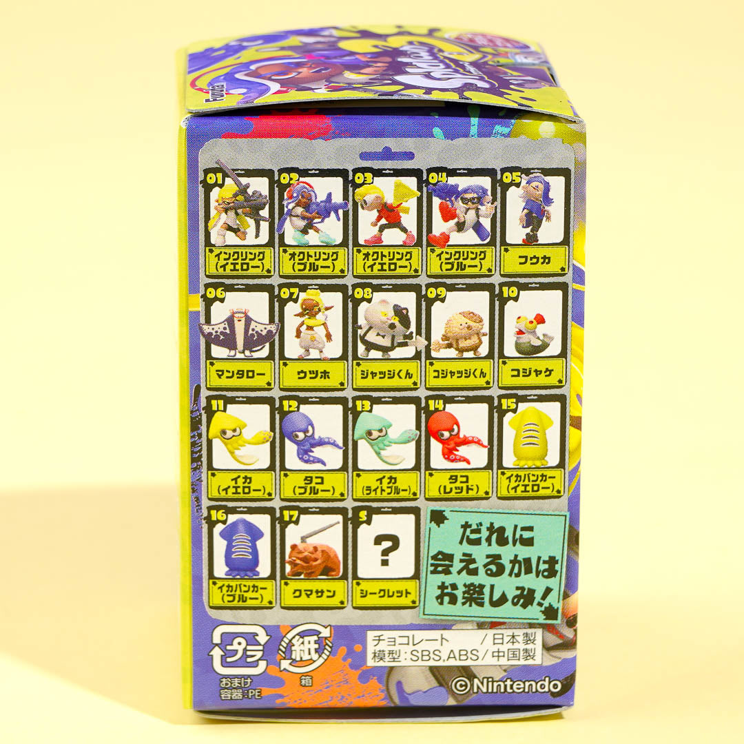 Have fun playing with this figure featuring the characters from the video game Splatoon! The figure is hidden in a yummy egg-shaped chocolate. Collect all 18 types of Splatoon figures!
