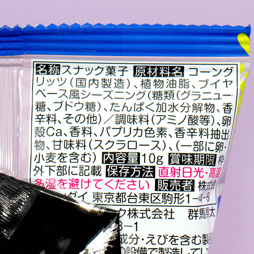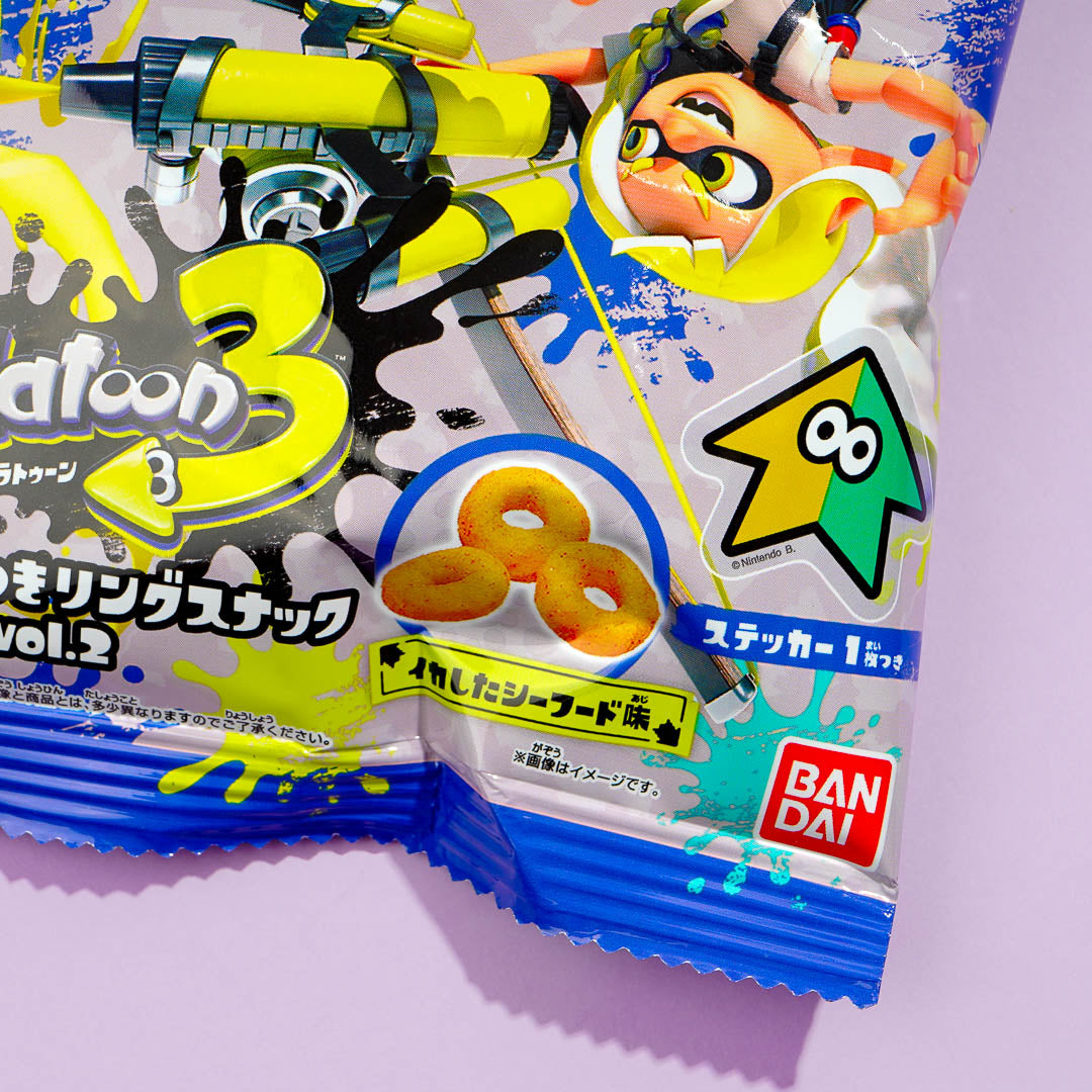 Have fun eating this seafood-flavored ring snack! It comes with a die-cut sticker that features illustrations from the video game Splatoon.