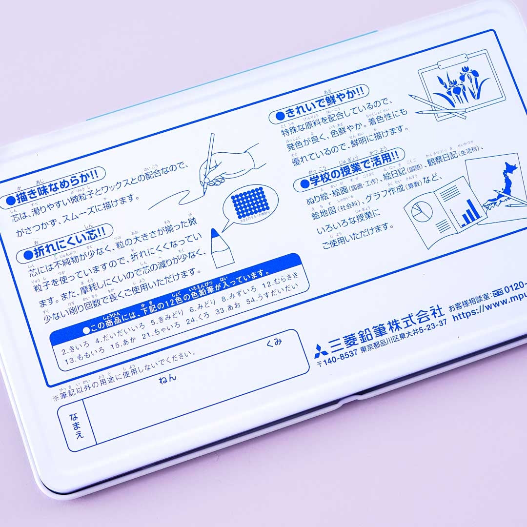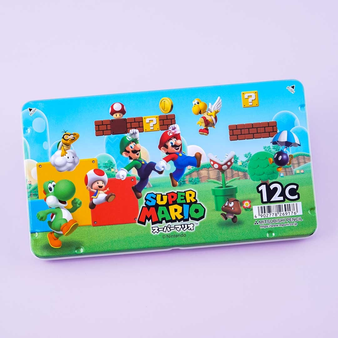 A set of colored pencils in a cute tin case illustrated with prints of the Super Mario game series