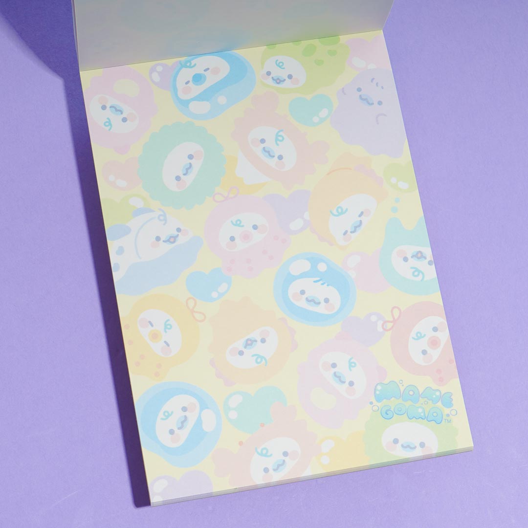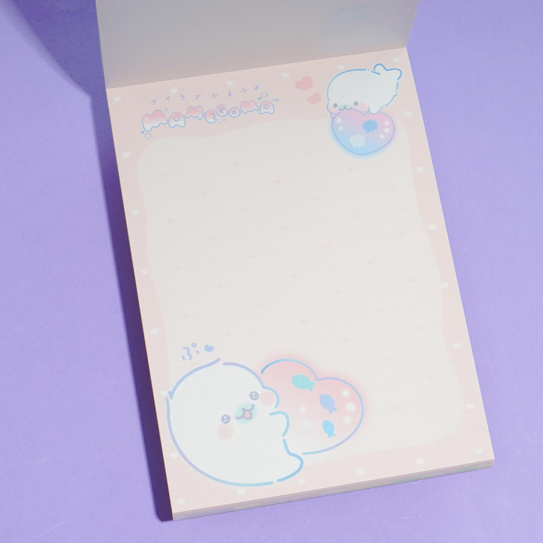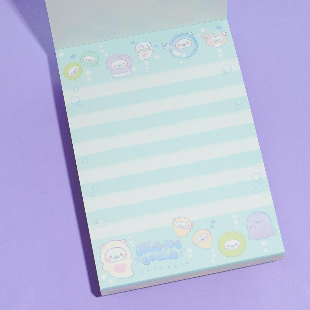 Draw some doodles on this kawaii memo pad! This pad features cute illustrations of Mamegoma seals wearing animal costumes in a sea full of hearts.
