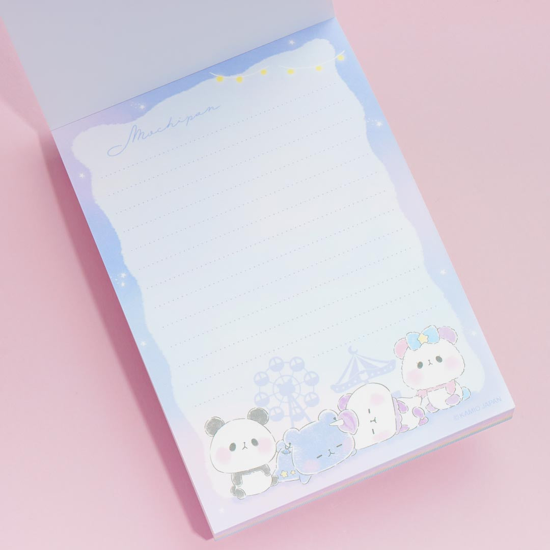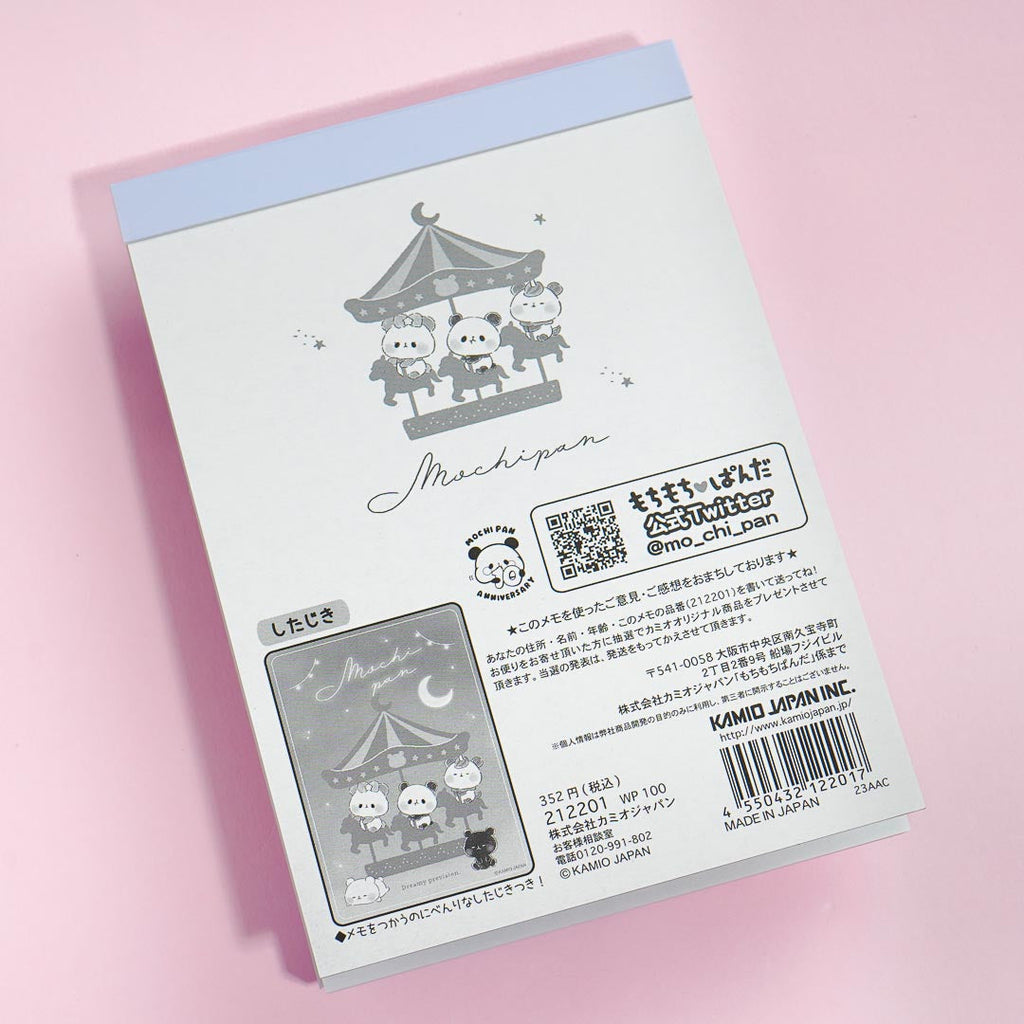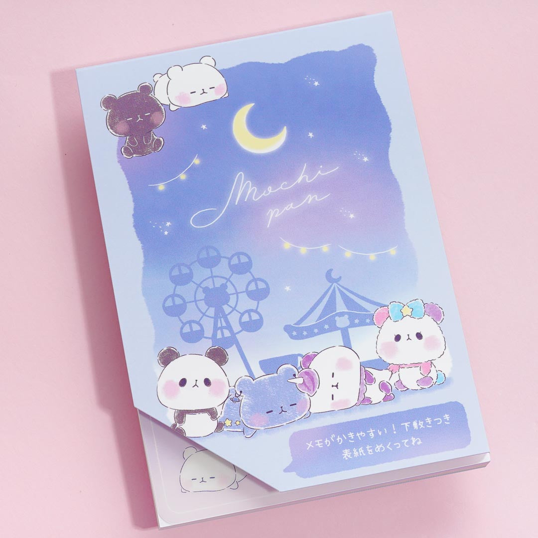 Write cute short notes and reminders using this kawaii memo pad! It features the 10th-anniversary themes of Mochi Mochi Panda which are the Amusement Park at Night theme and Snack Time theme. This also comes with an underlay pad that you can place under the paper for easier note-writing!