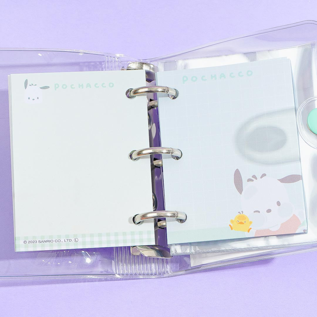 Write down ideas as they come along with the help of this kawaii mini binder notebook. It showcases a print of Pochacco and one of the Pi-Chans squishing their faces! It has a nice plastic cover with a button closure.