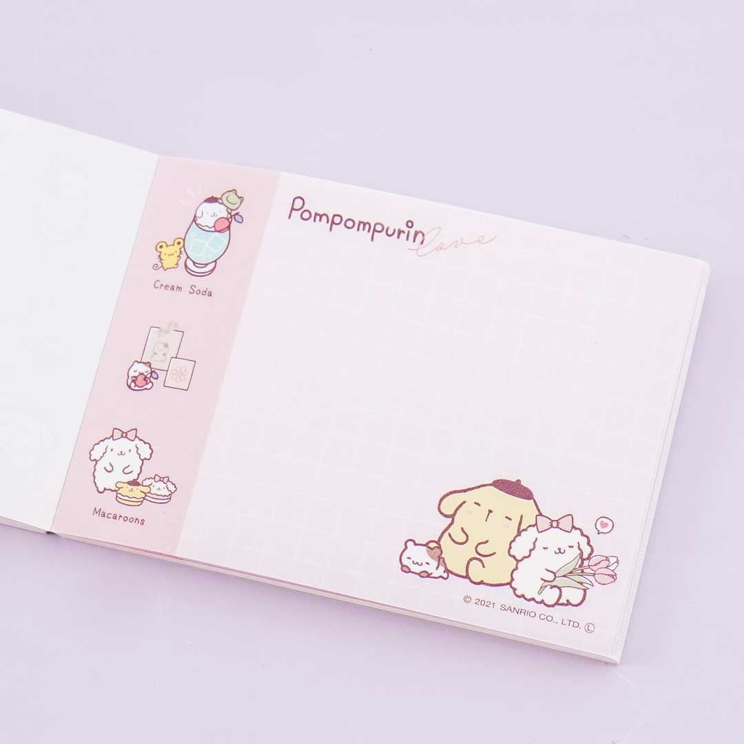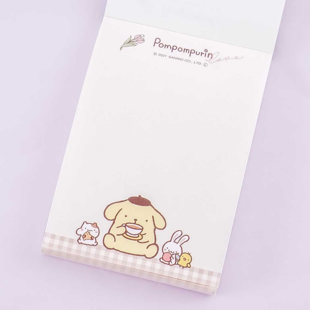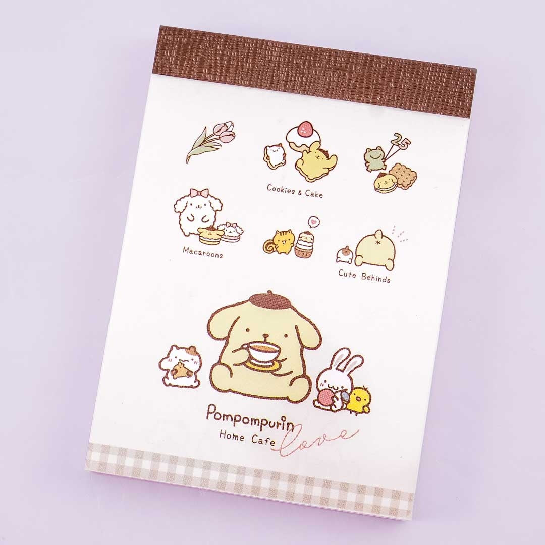 • A super kawaii memo pad featuring prints of Pompompurin and his friends enjoying cafe treats