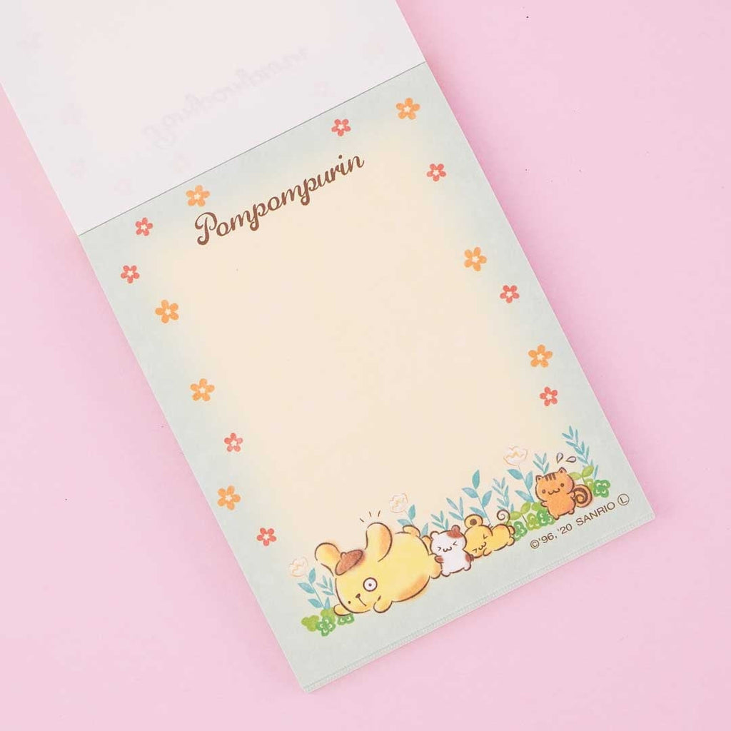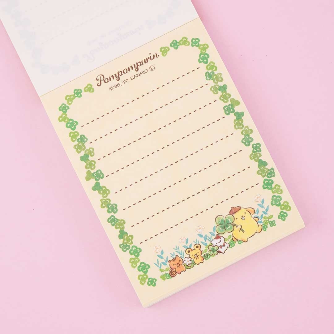 • A memo pad with kawaii illustrations of Pompompurin harvesting clovers with friends