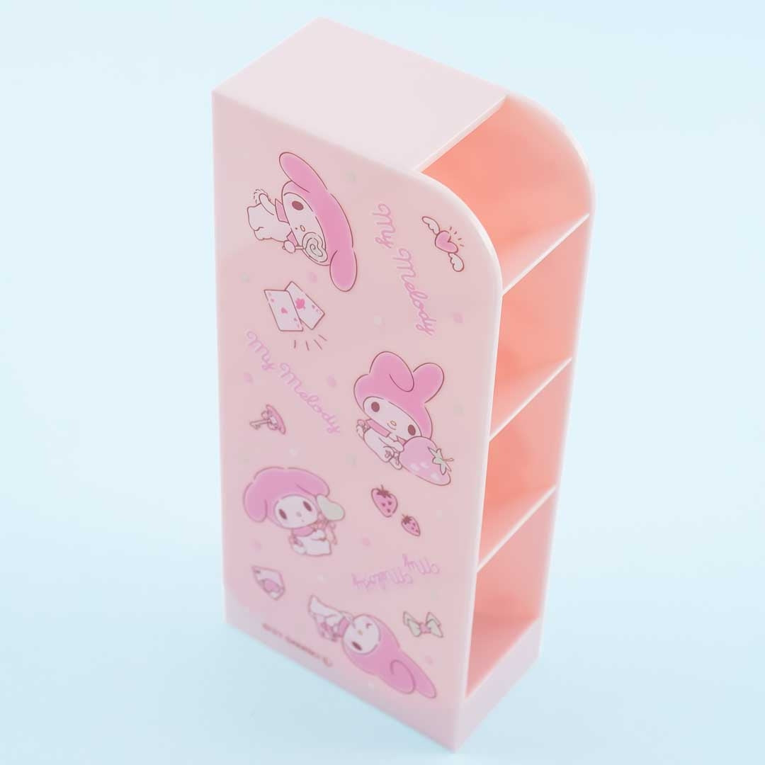 Have fun sorting out your favorite markers, ballpoint pens, and other writing tools by sliding them on the four separate compartments of this kawaii standing organizer! It’s decorated with illustrations of My Melody and her favorite stuff like strawberries, lollipops, ribbons, and more! This slim-type stand is made of durable plastic.