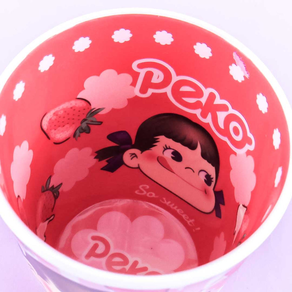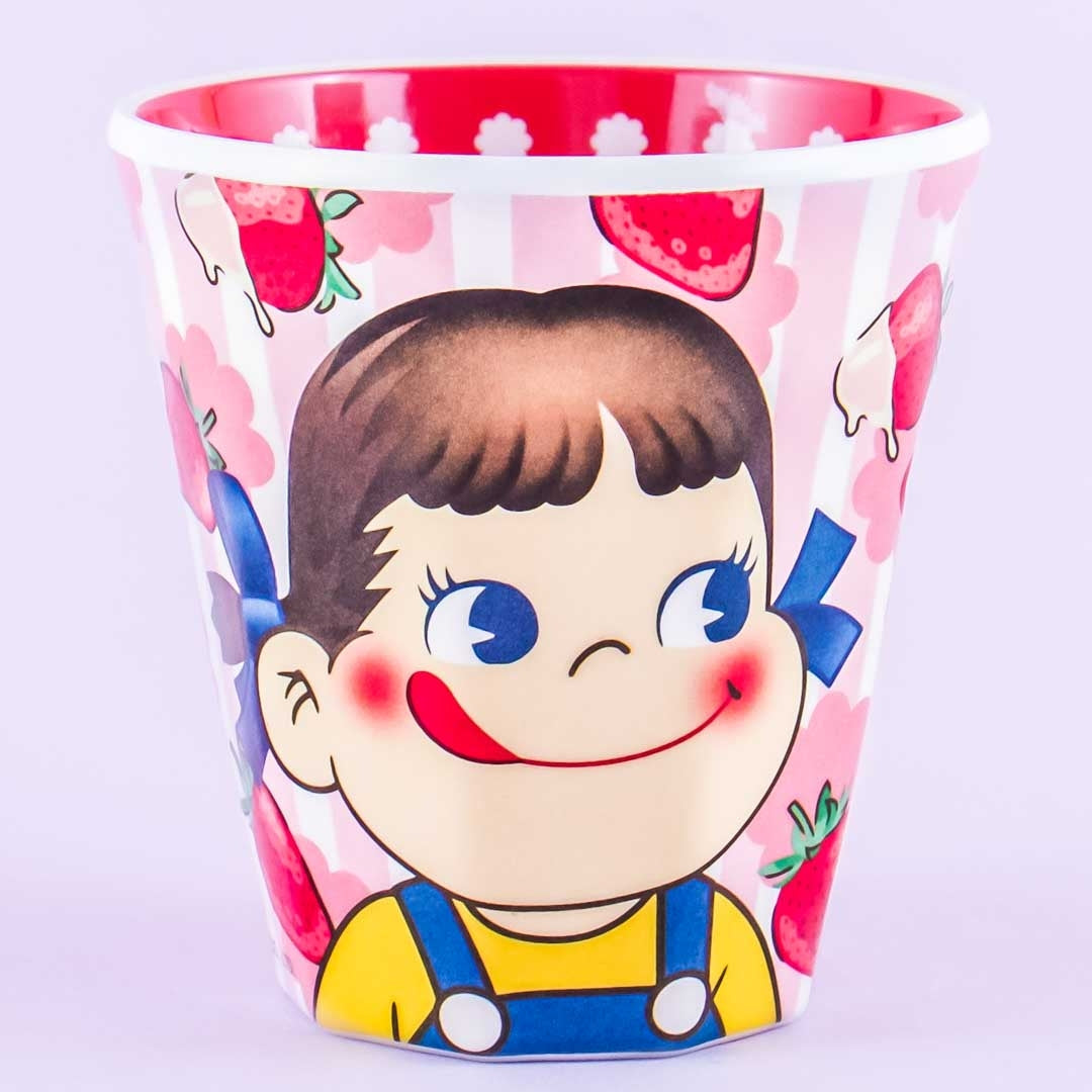 • A super cute cup featuring Milky's Peko-chan with strawberries dipped in cream