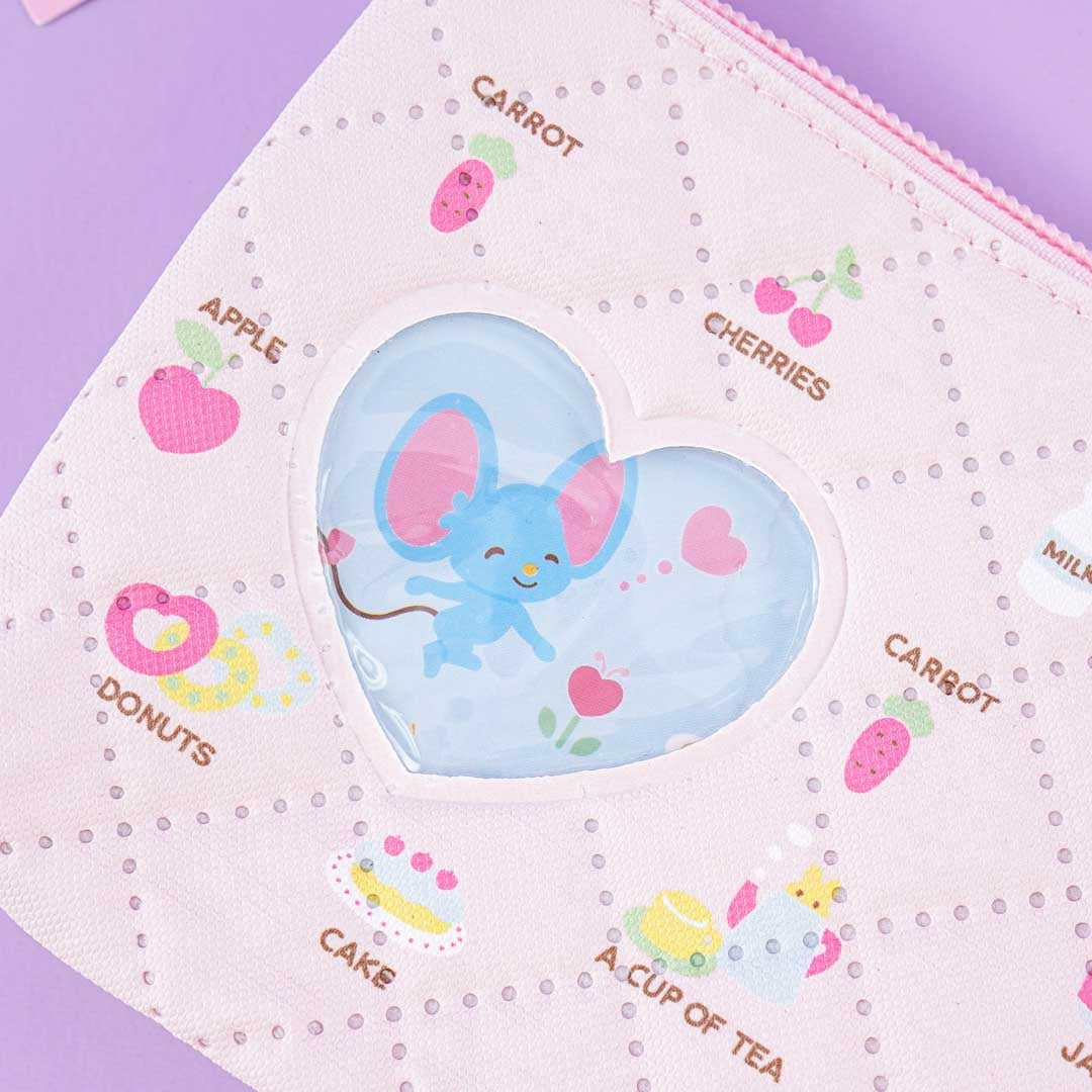 Store your pens and pencils inside this super cute quilted case. It's illustrated with My Melody surrounded by yummy goodies! This zippered pen case has two inner pockets and a heart-shaped clear blue window.
