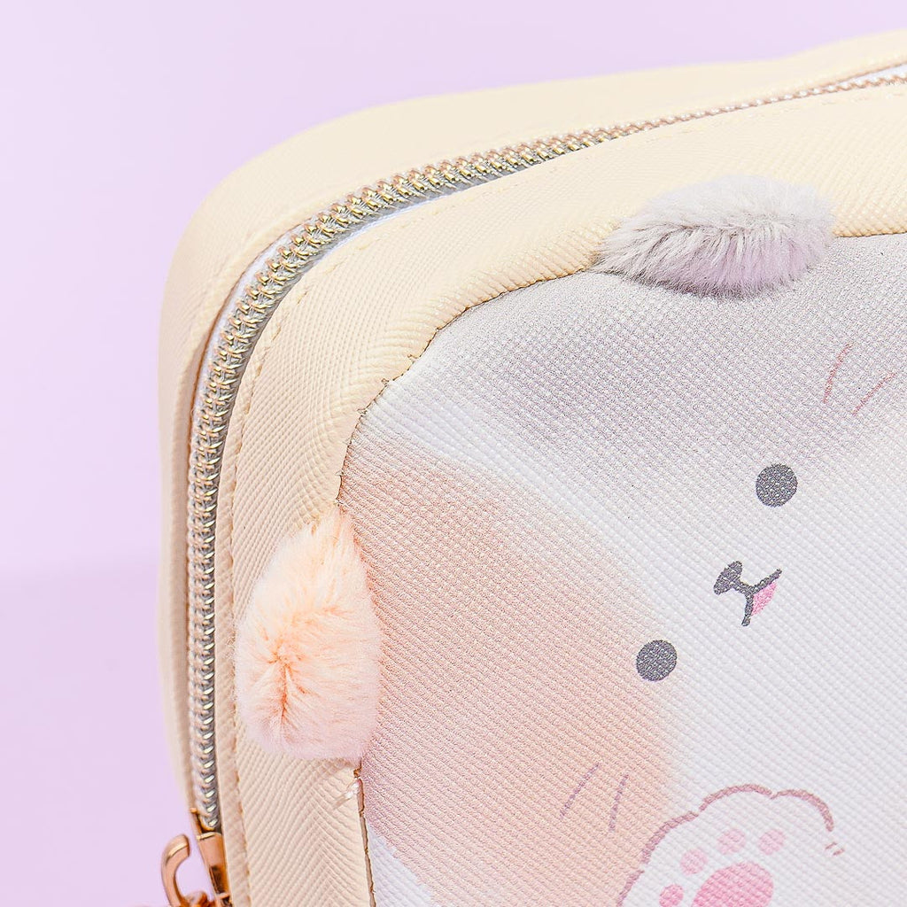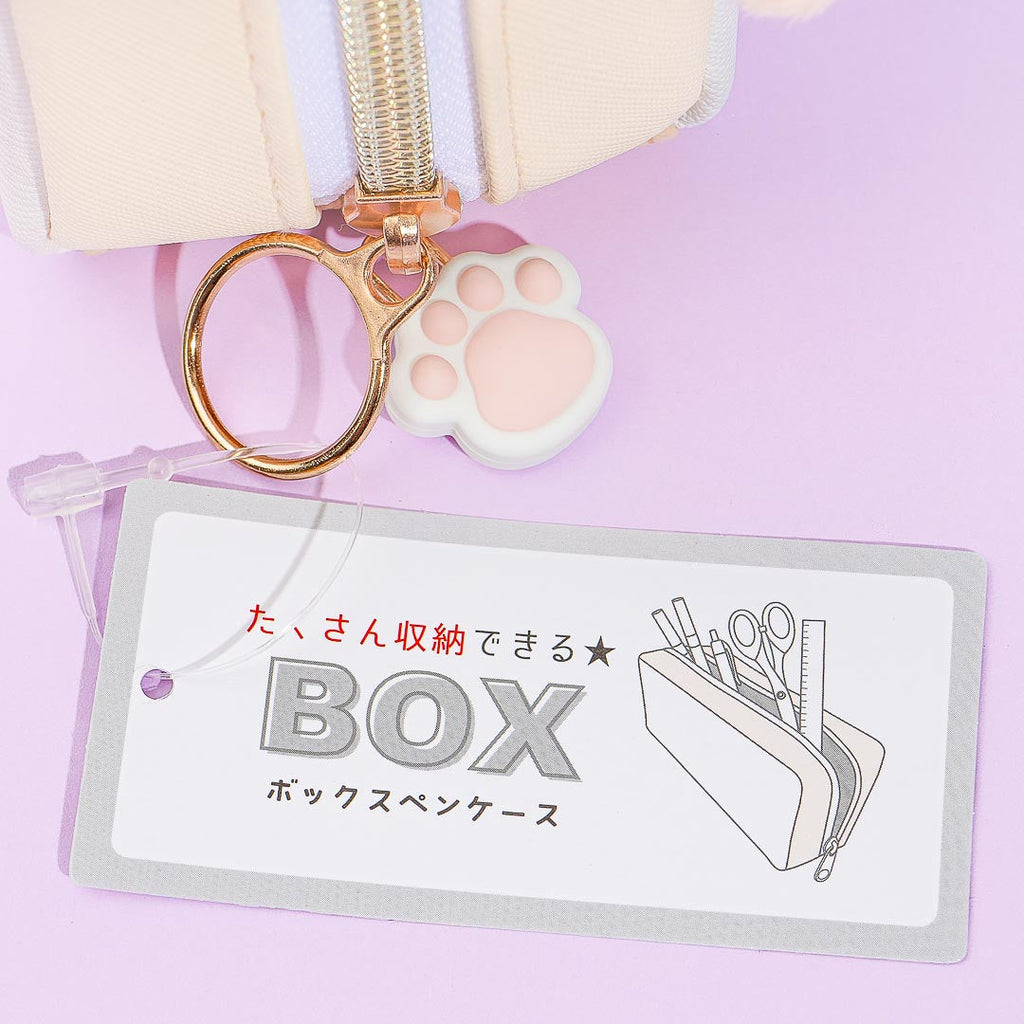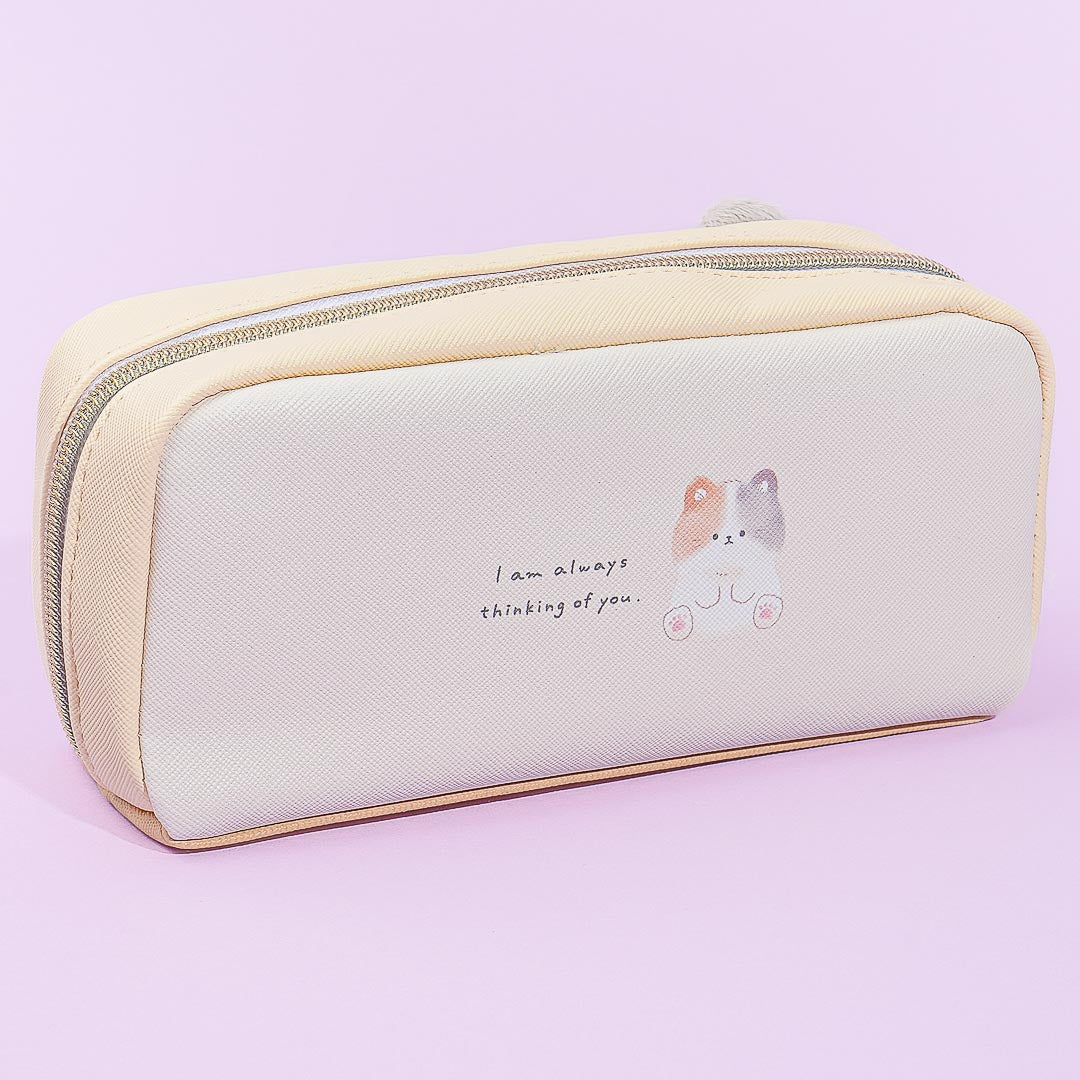 Organize your writing tools using this super cute zippered case! It showcases a cute illustration of a fluffy cat asking for a pat on its tummy. The zipper has a cute round handle and a rubber paw charm!