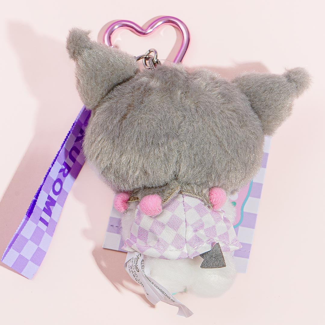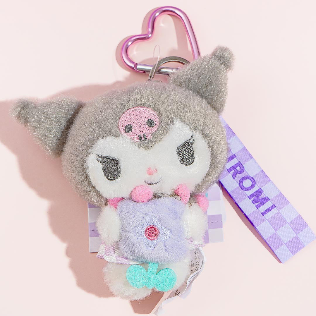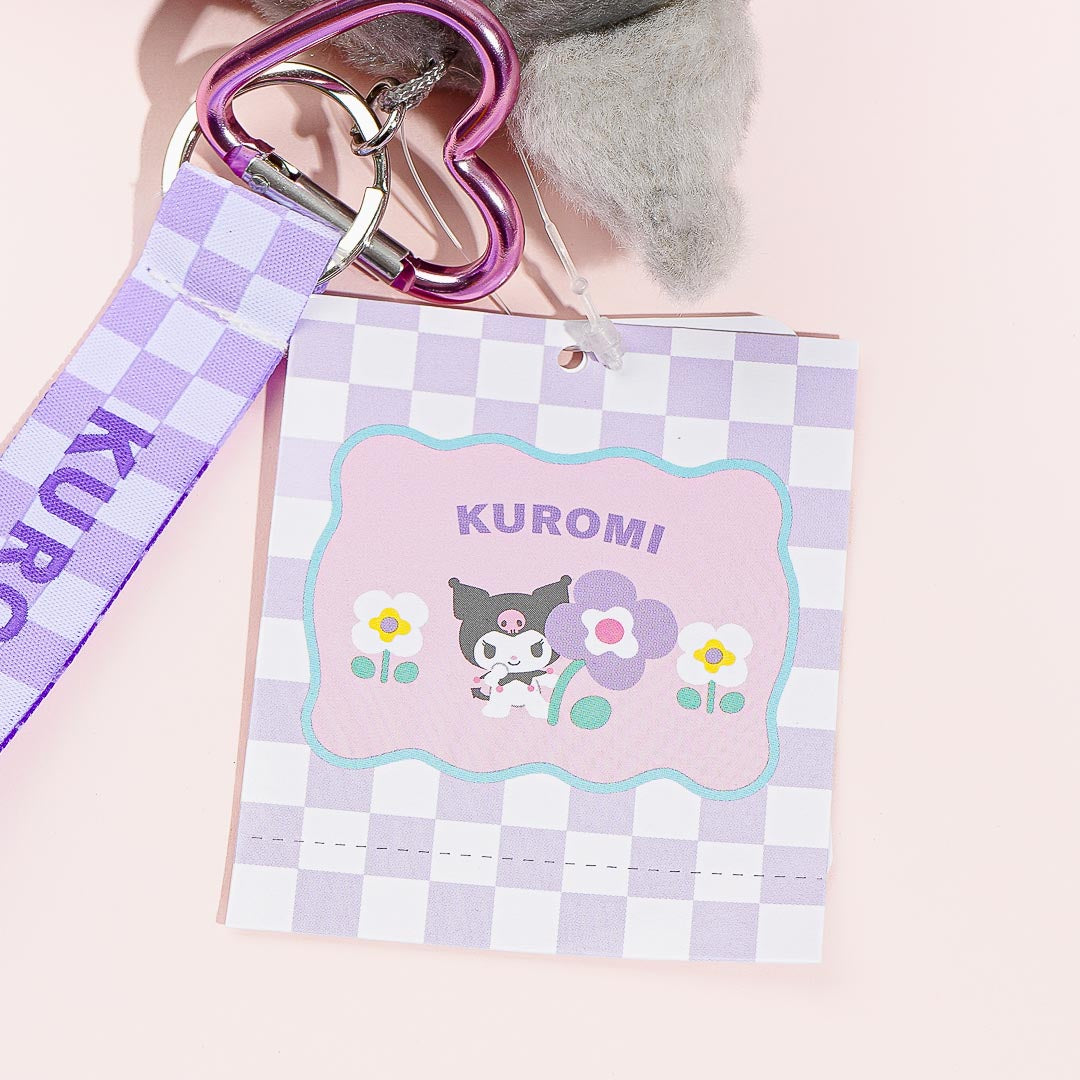 This super kawaii Kuromi plush charm is holding a purple flower and is wearing a checkered dress! It also comes with a heart-shaped metal carabiner and a checkered wrist with Kuromi's name. Attach this to your bag for a dose of cuteness!