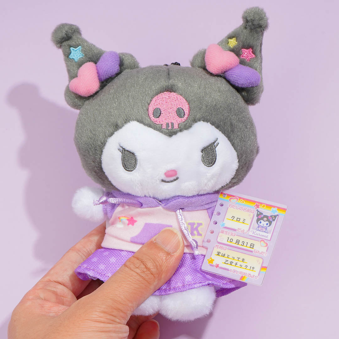 Kuromi is all dressed up in a kawaii outfit and is holding her profile book or slam book which is popular among teenagers in the 90s. You can attach this small-sized plushie to your bag with its removable ball chain!