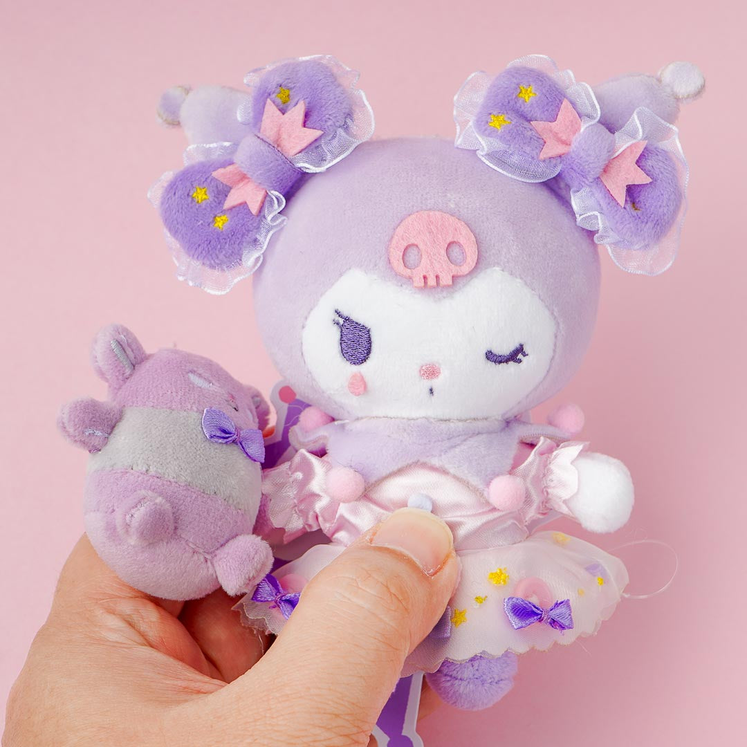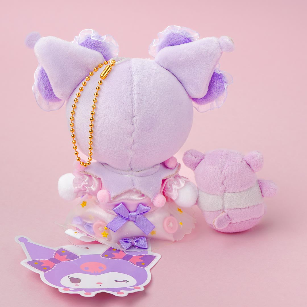 Go to your favorite cafe bringing along this kawaii Kuromi plush charm. This medium-sized cutie is dressed up as a Sweet Lolita! It's holding the baby version of Baku.