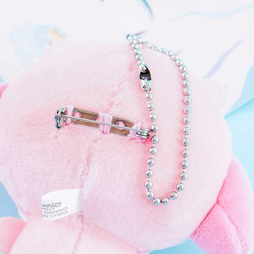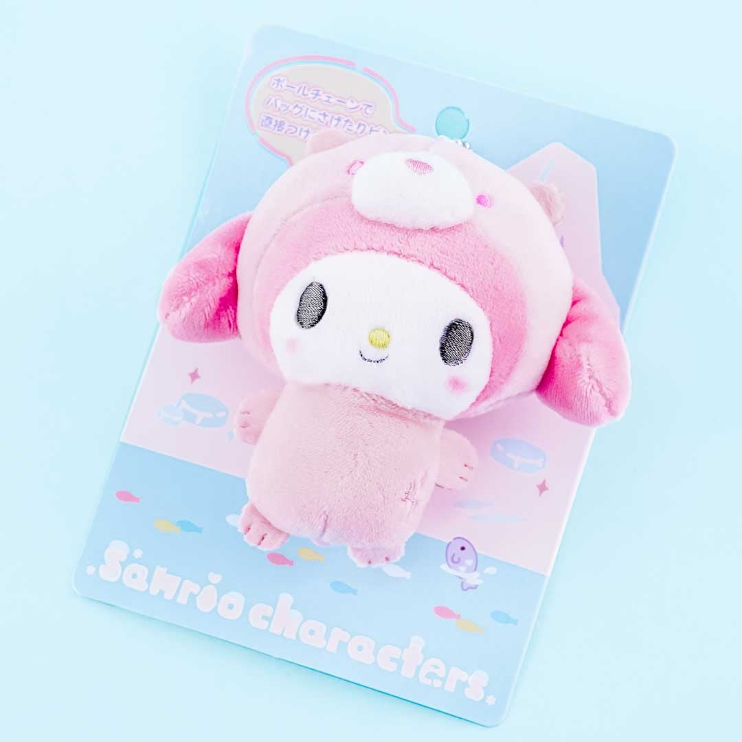 This super kawaii mini My Melody plushie charm is wearing a polar bear costume! It comes from the Sanrio Ice Friends series. You can attach it to your bag with its detachable ball chain or its brooch pin.