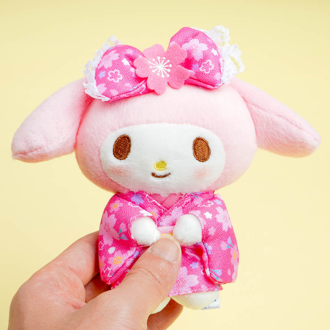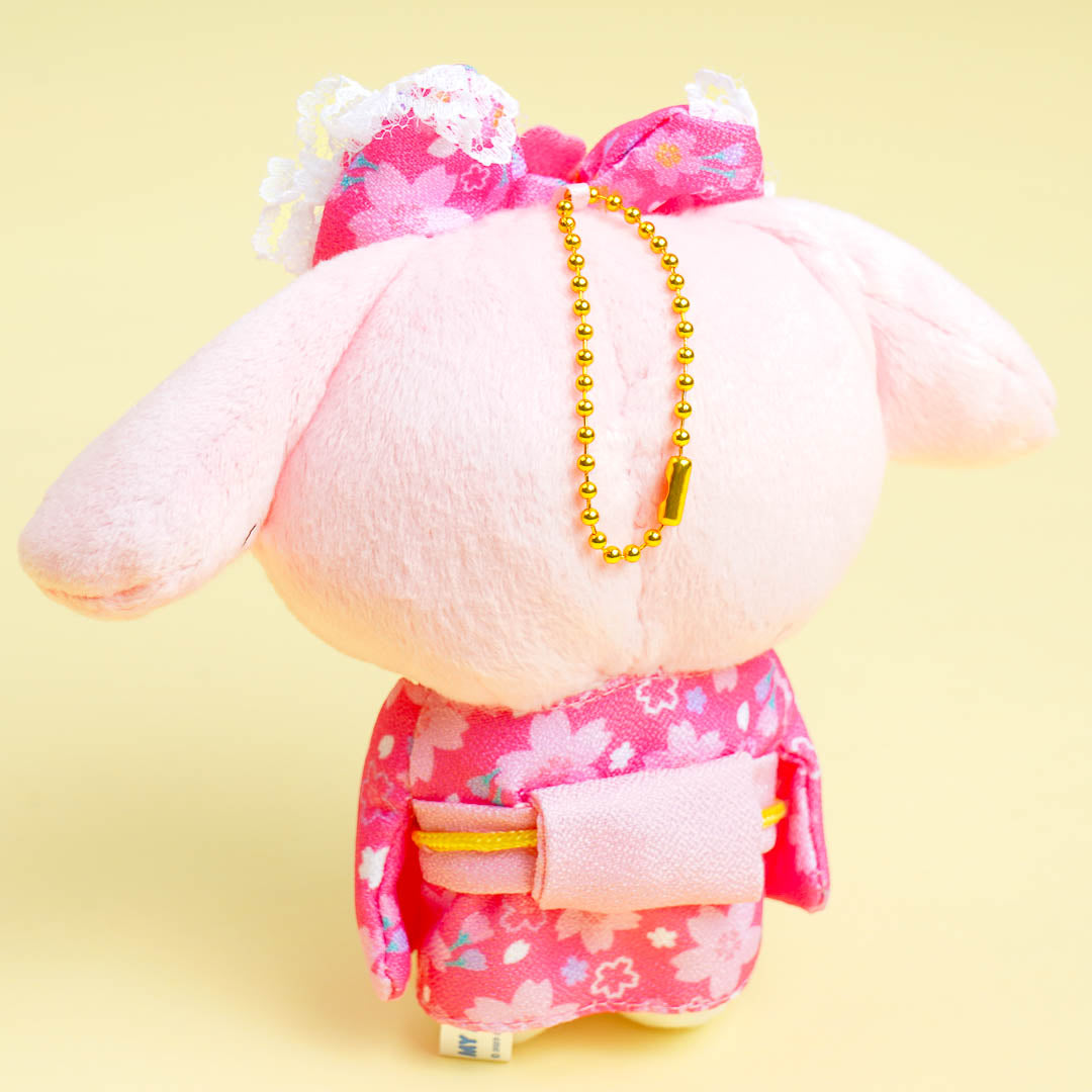 This cute My Melody plushie charm is wearing a kimono covered in prints of sakura blossoms. It comes from the Sanrio Sakura Kimono series! Bring along this medium-sized cutie on your trips and adventures.