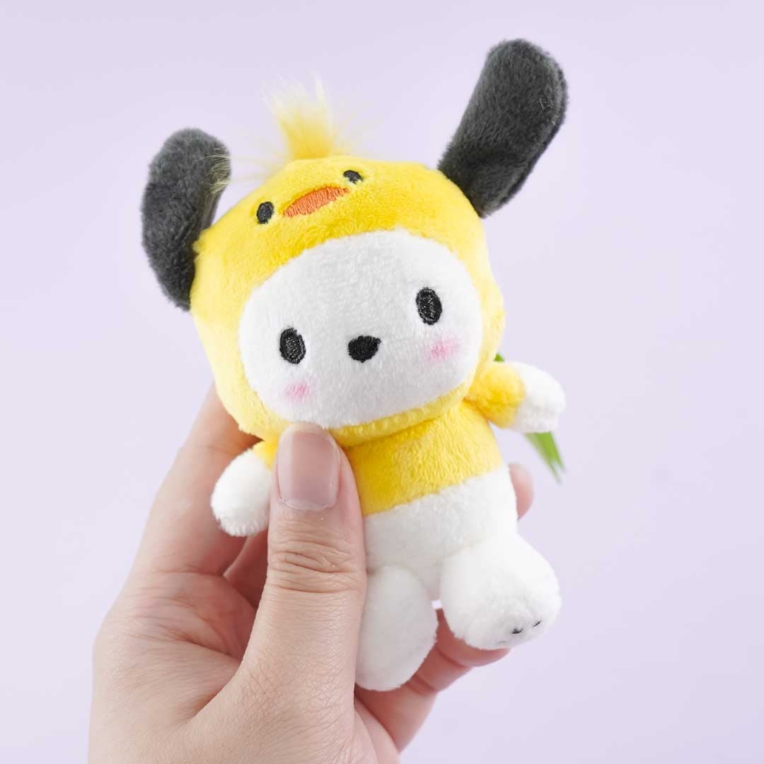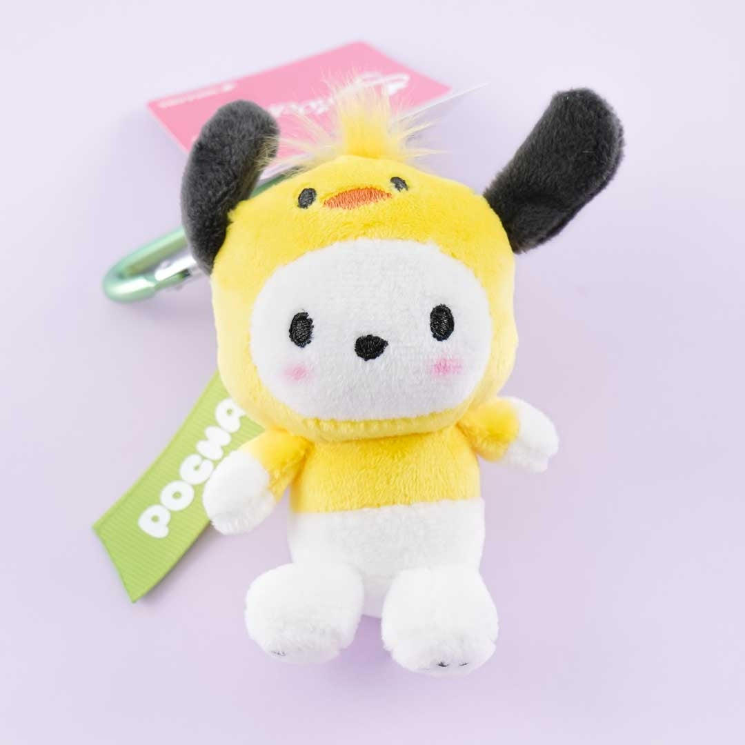 Pochacco is doing a Kigurumi or animal cosplay by dressing up as a chick. This kawaii mini plushie also doubles as a bag charm. It comes with a carabiner, metal snap hook, keyring, and a name tag. Attach this cutie to your favorite purse so you can take Pochacco wherever you go.