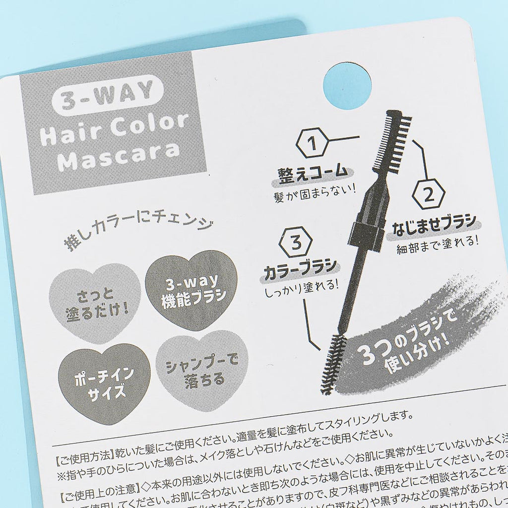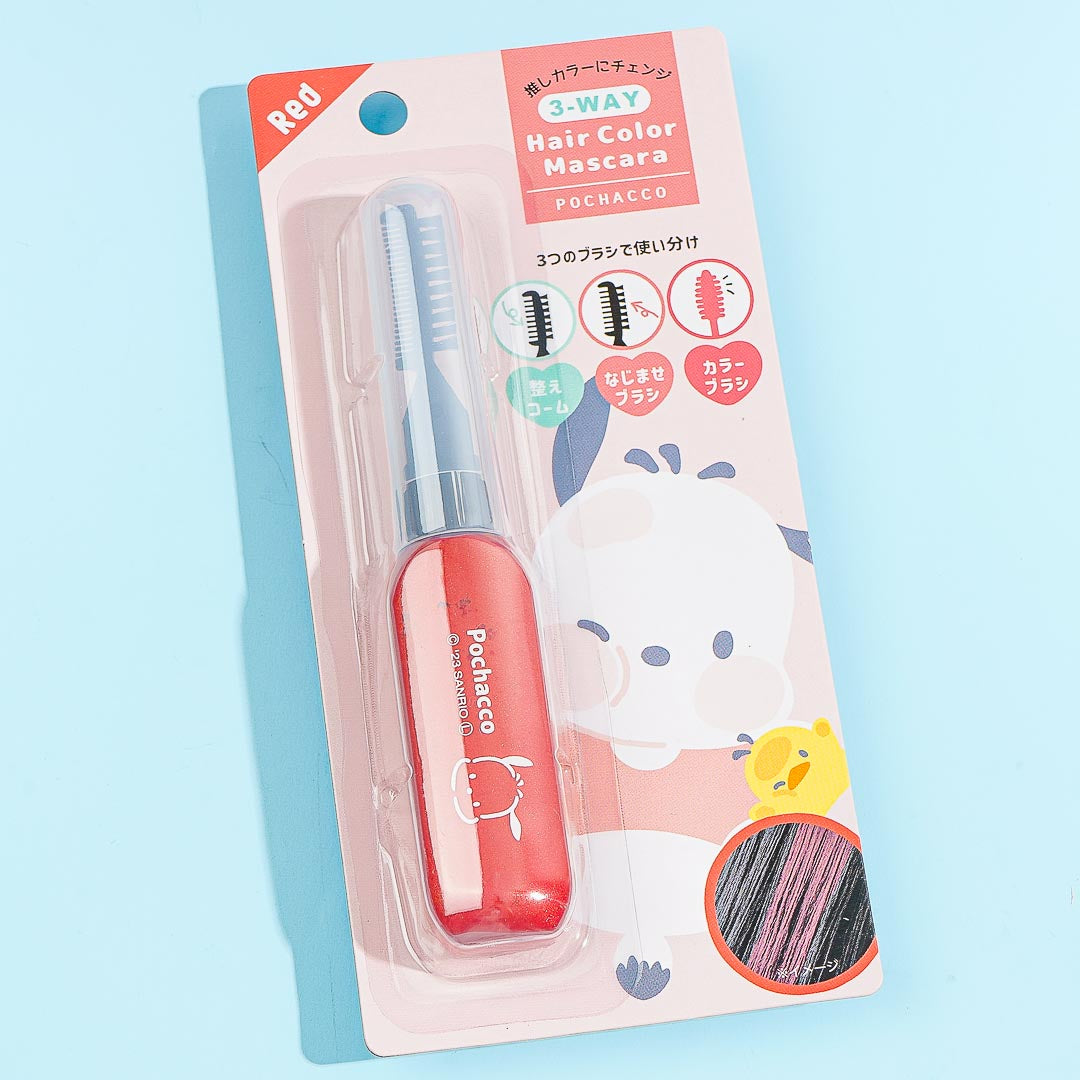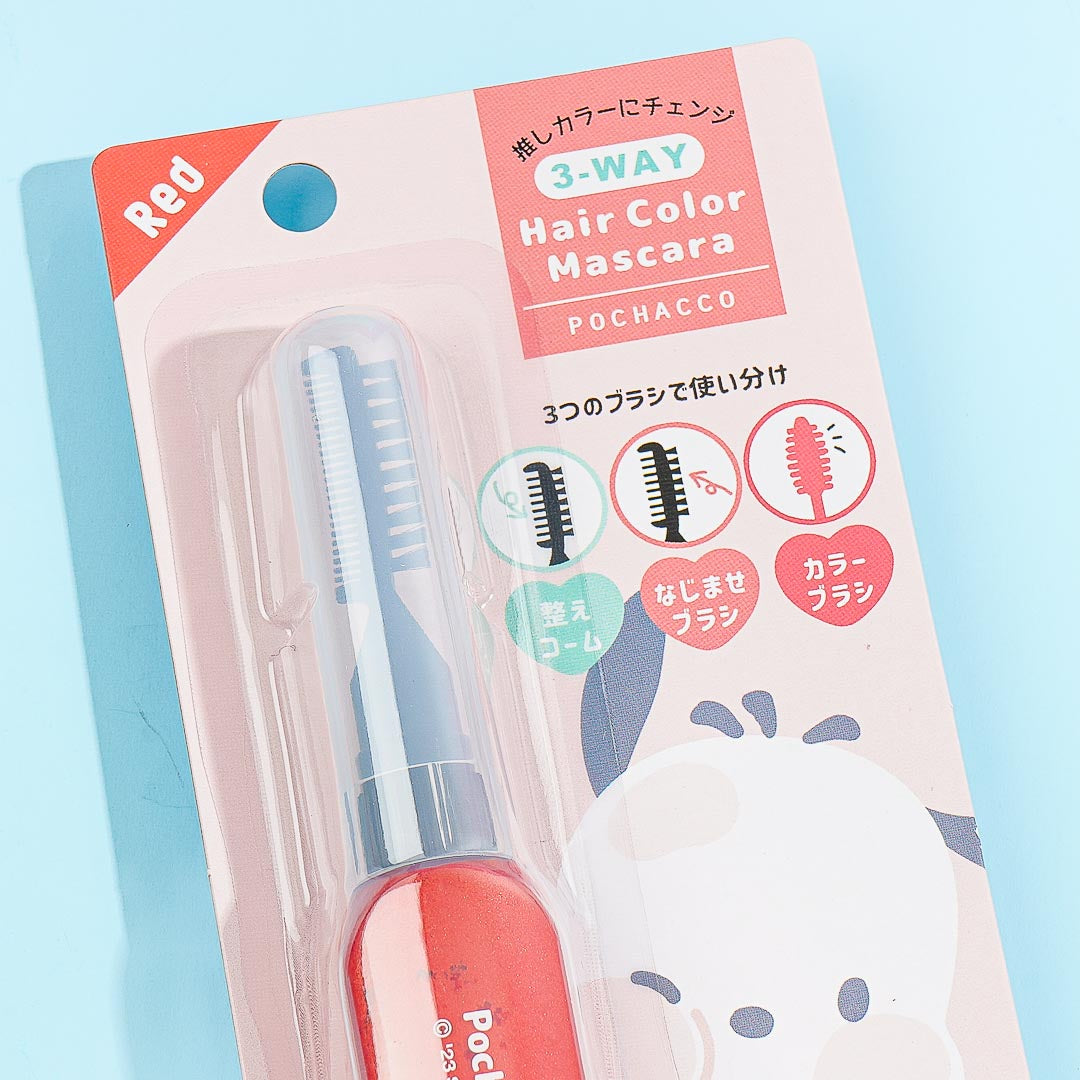 Add this tube of hair color mascara to your beauty kit. It features a print of Pochacco! This mascara can turn your hair red. Have fun using its three different brushes - a smoothing a comb, a blending brush, and a color brush.