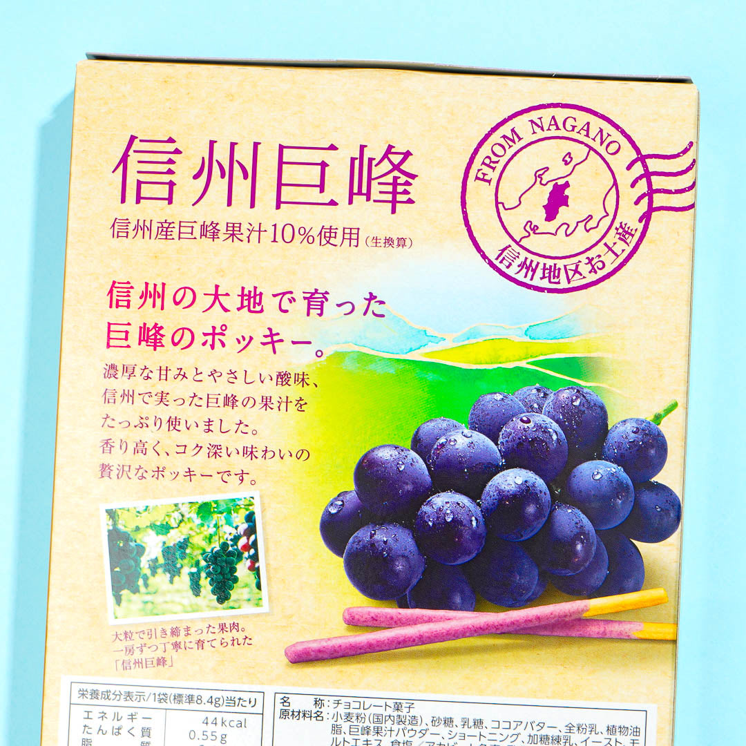 Have a taste of the delicious Kyoho grapes from the Shinsu region in Japan by snacking on these giant Pocky sticks. Each biscuit stick is dipped in delicious cream mixed together with Kyoho grape juice! Enjoy the rich sweetness and gentle sourness of Japanese grapes with this Shinsu-limited box of Pocky.
