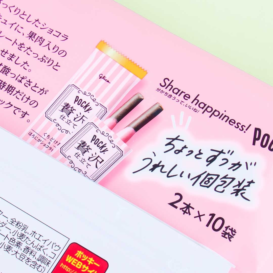 Have fun munching on these thin Horoniga chocolate biscuit sticks! Each piece is generously coated with strawberry chocolate that has crushed fruit bits — making every bite more luxurious.