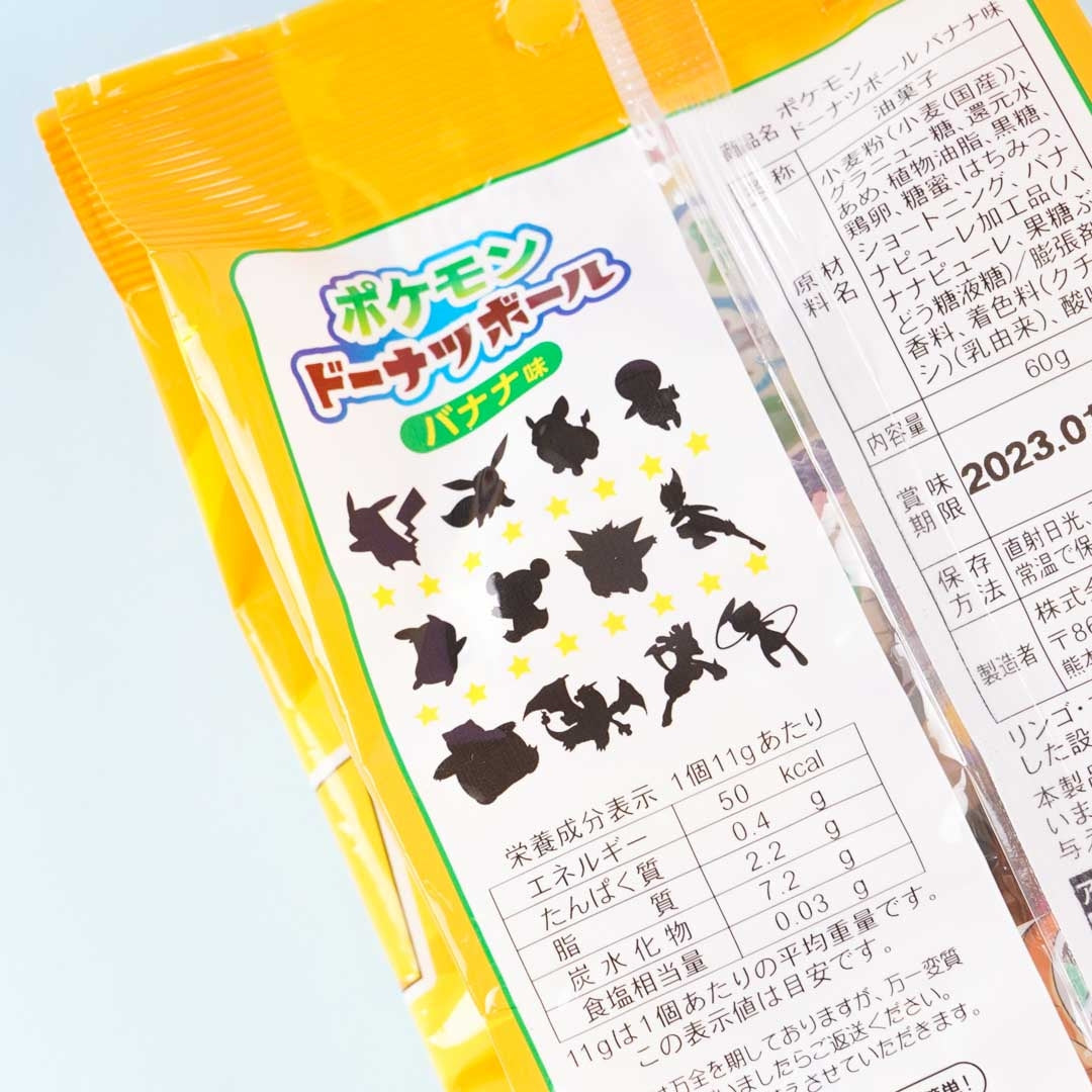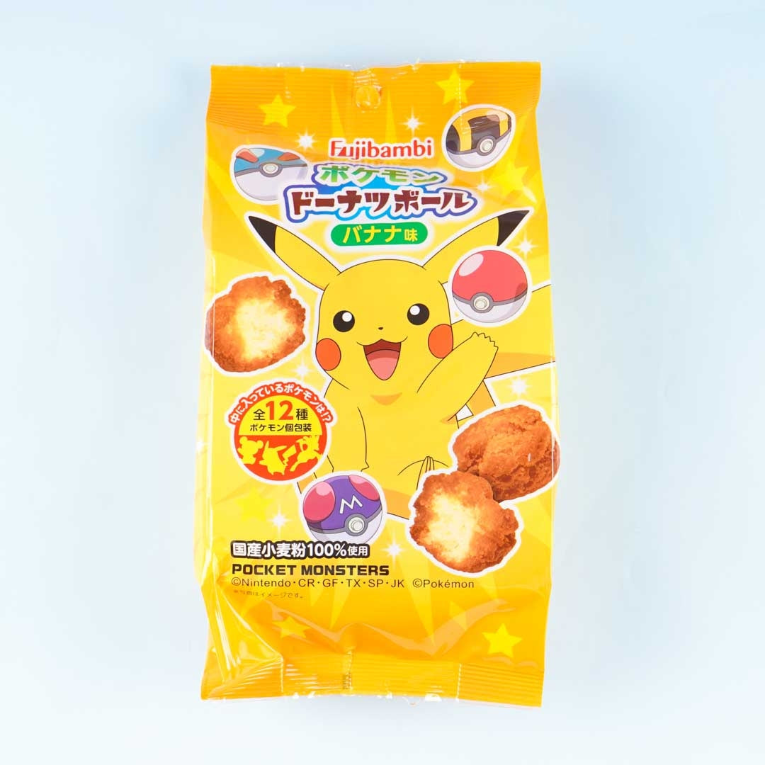 • A pack of banana-flavored donut balls illustrated with Pokemon