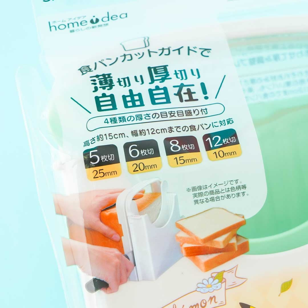 Features a knife guard and different bread thickness measurement guides: 5 slices (25 mm), 6 slices (20 mm), 8 slices (15 mm), and 12 slices (10 mm)