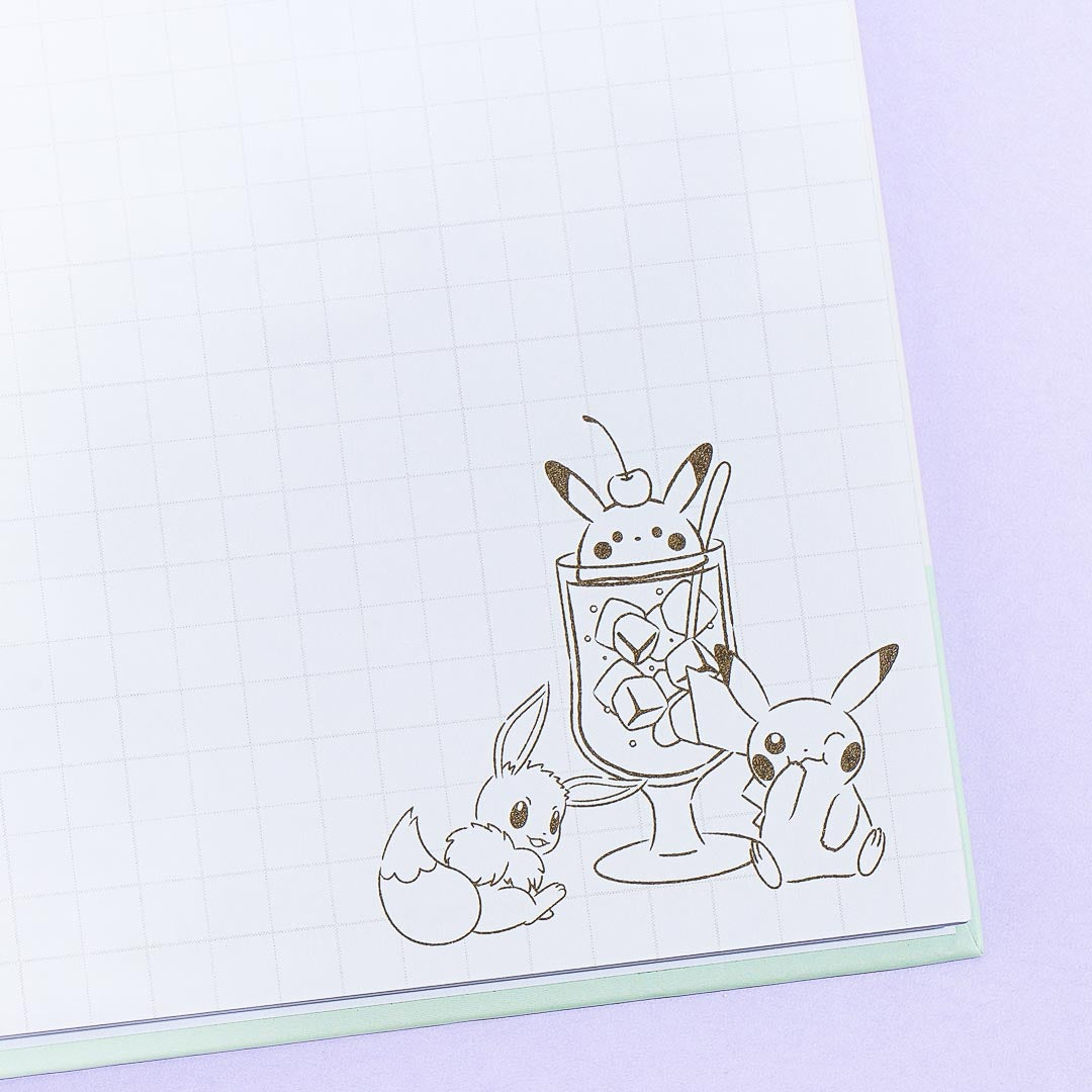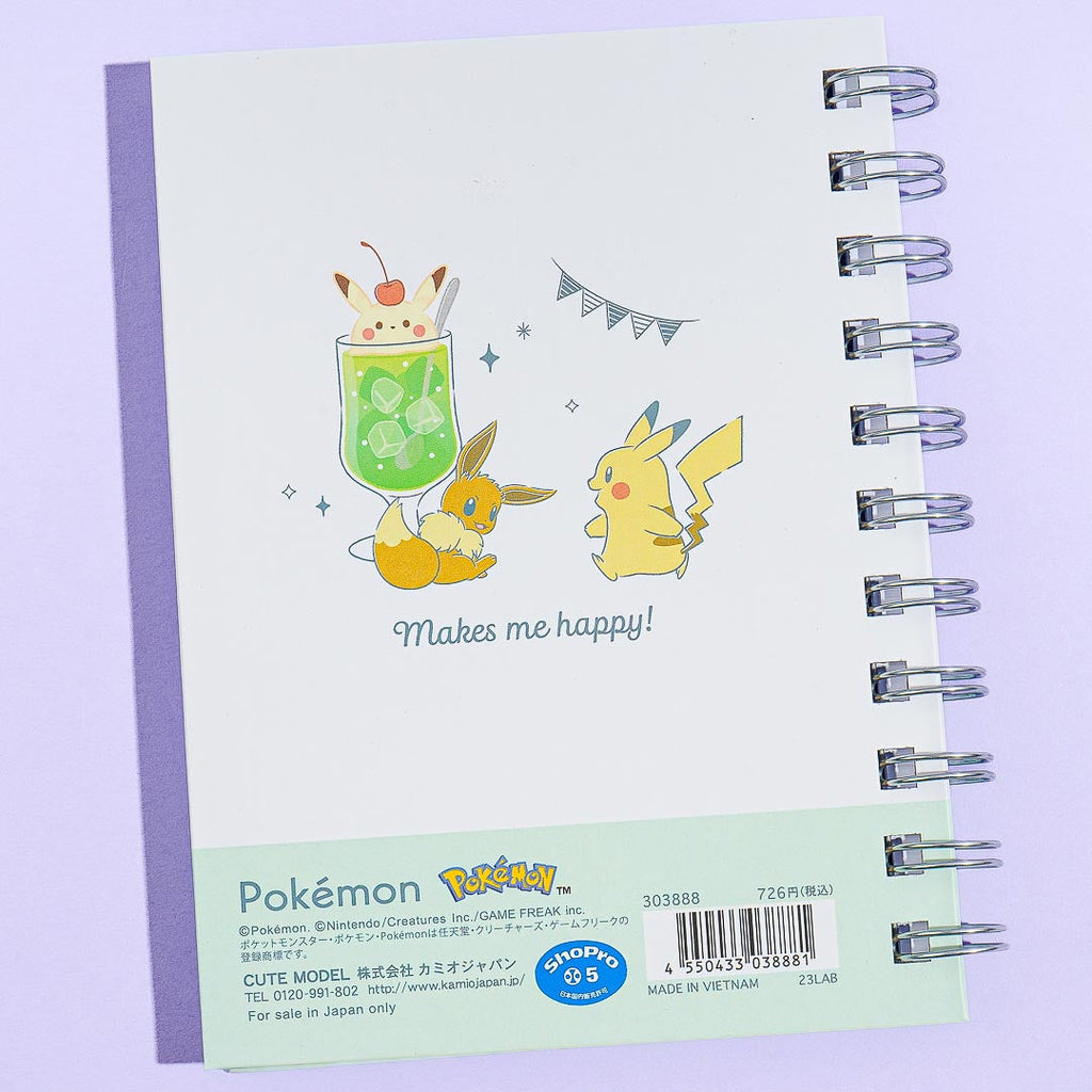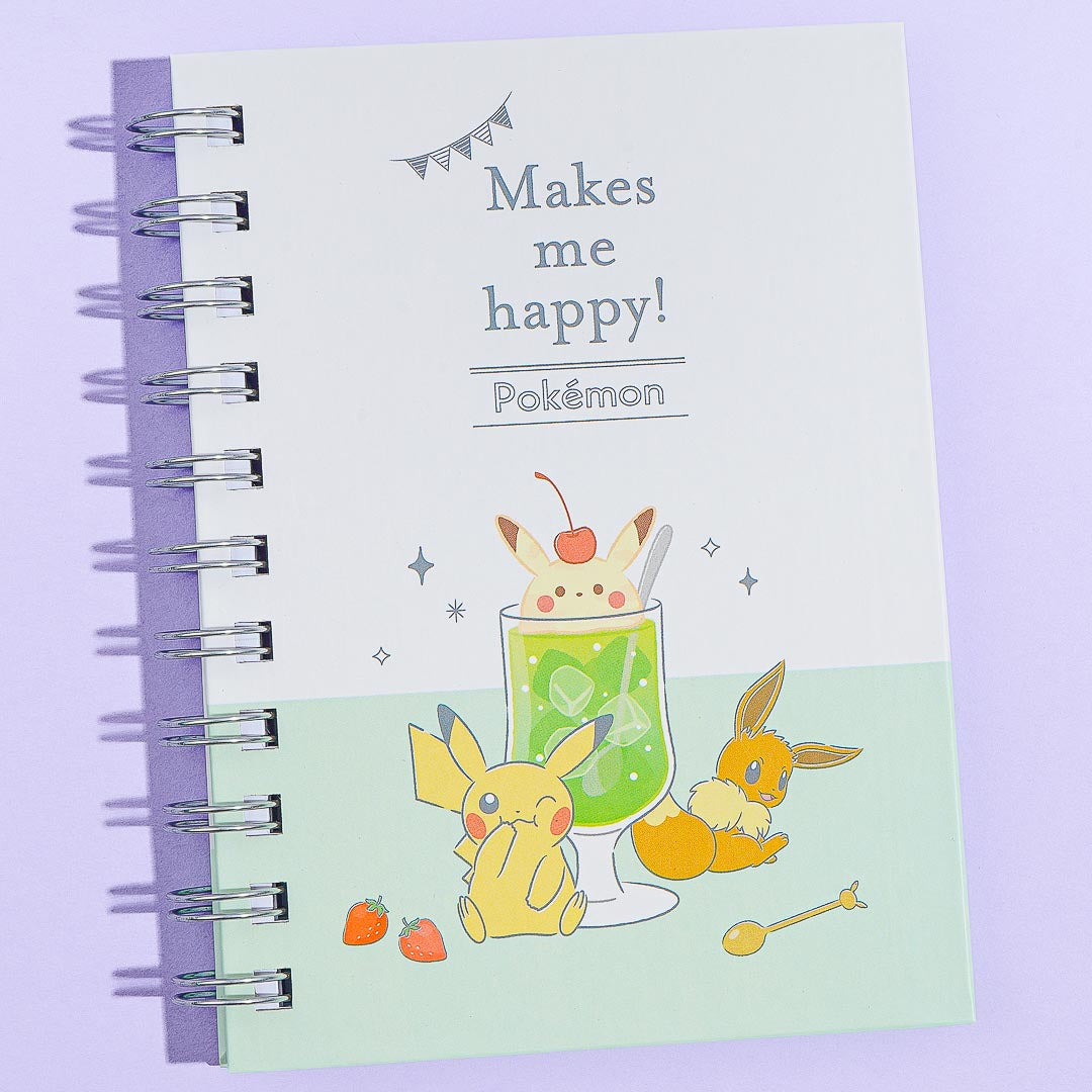 Scribble down important notes and reminders using this kawaii ring notebook! It features a super cute illustration of Pikachu and Eevee enjoying a giant glass of melon cream soda together.