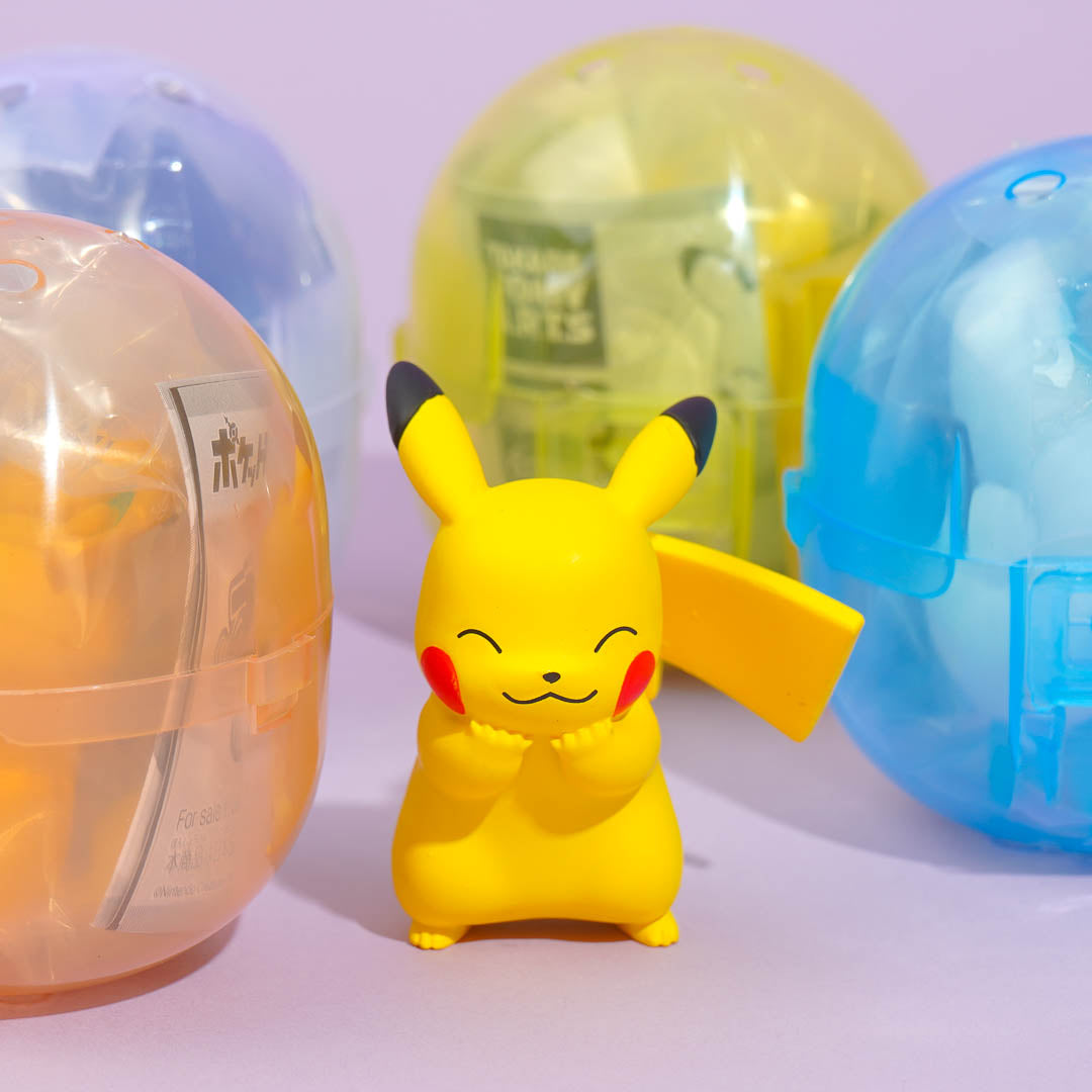 Open the colorful gachapon capsule to reveal a cute Pokemon figure! It comes from the Pokemon SuriSuri Figure series. Try to complete all of the four different figures in the collection!