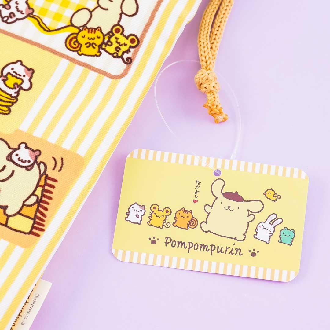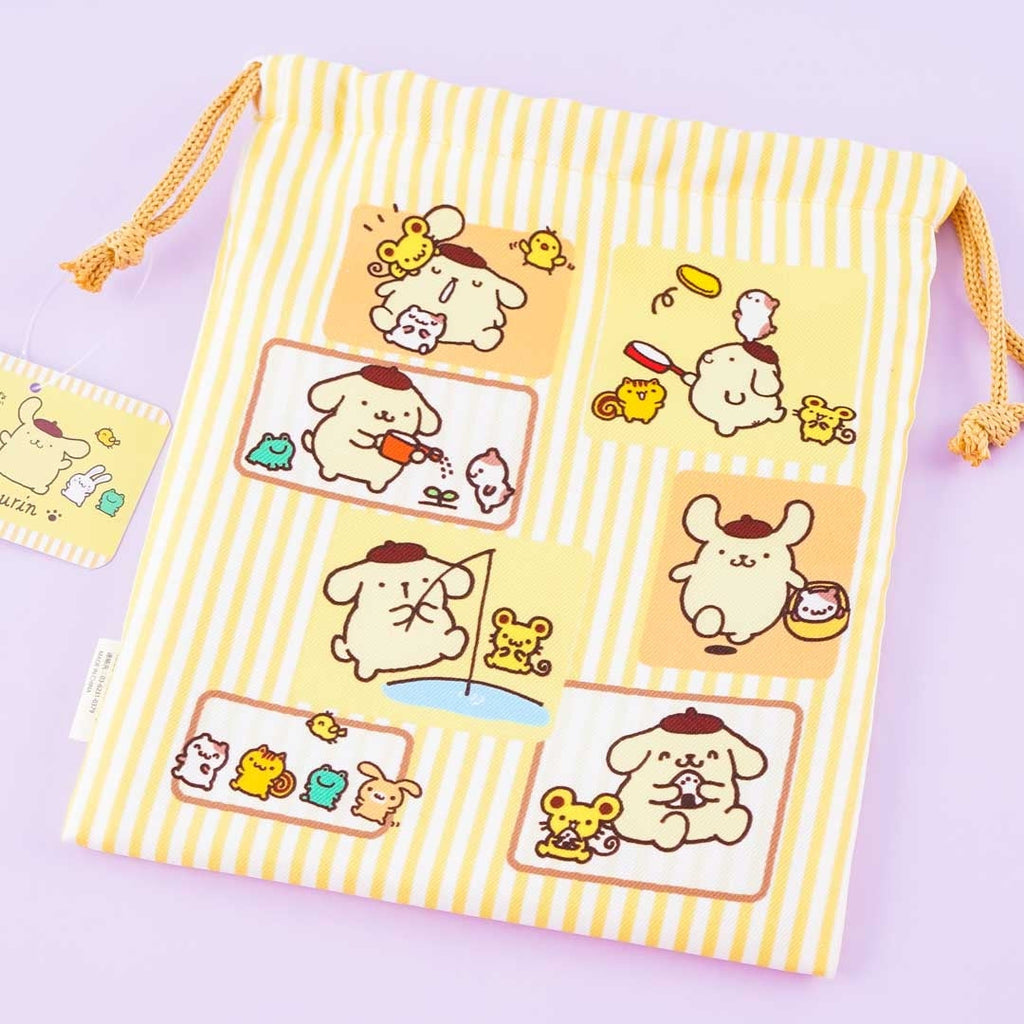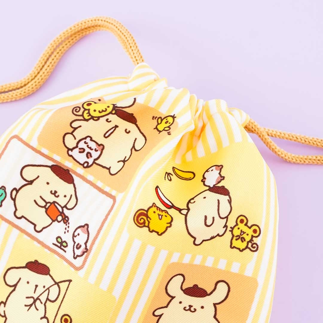 A cute drawstring pouch with prints on both sides featuring Pompompurin doing daily activities with friends