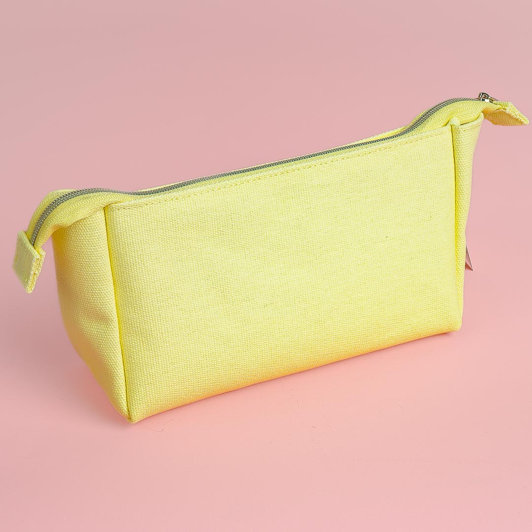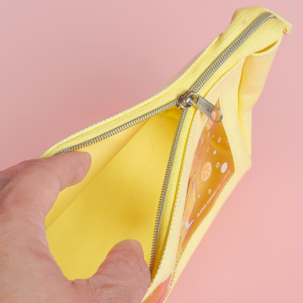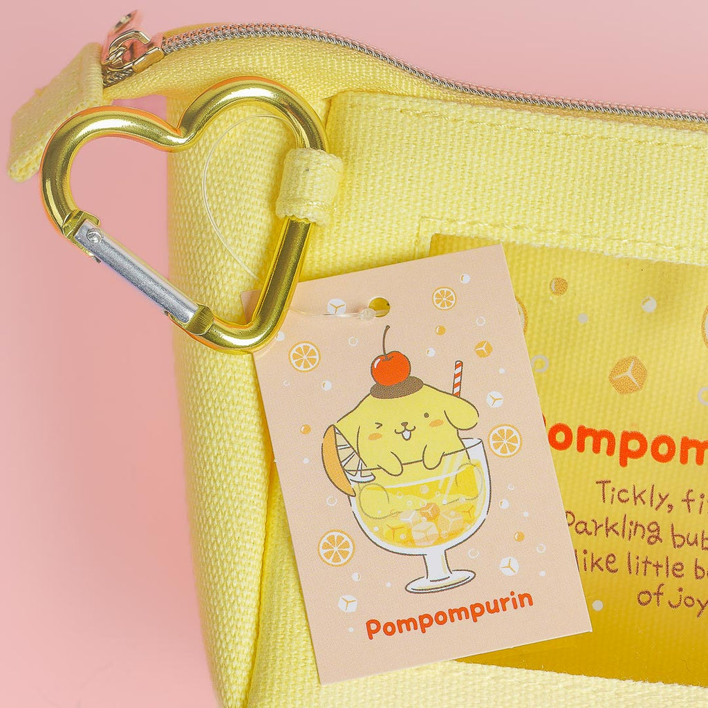 Store your cosmetics or writing materials in this super cute canvas pouch that features Pompompurin in a glass of fruity soda! It's made from canvas material and has a clear window design so you can see what's inside. The pouch also comes with a heart-shaped metal carabiner where you can attach cute charms.