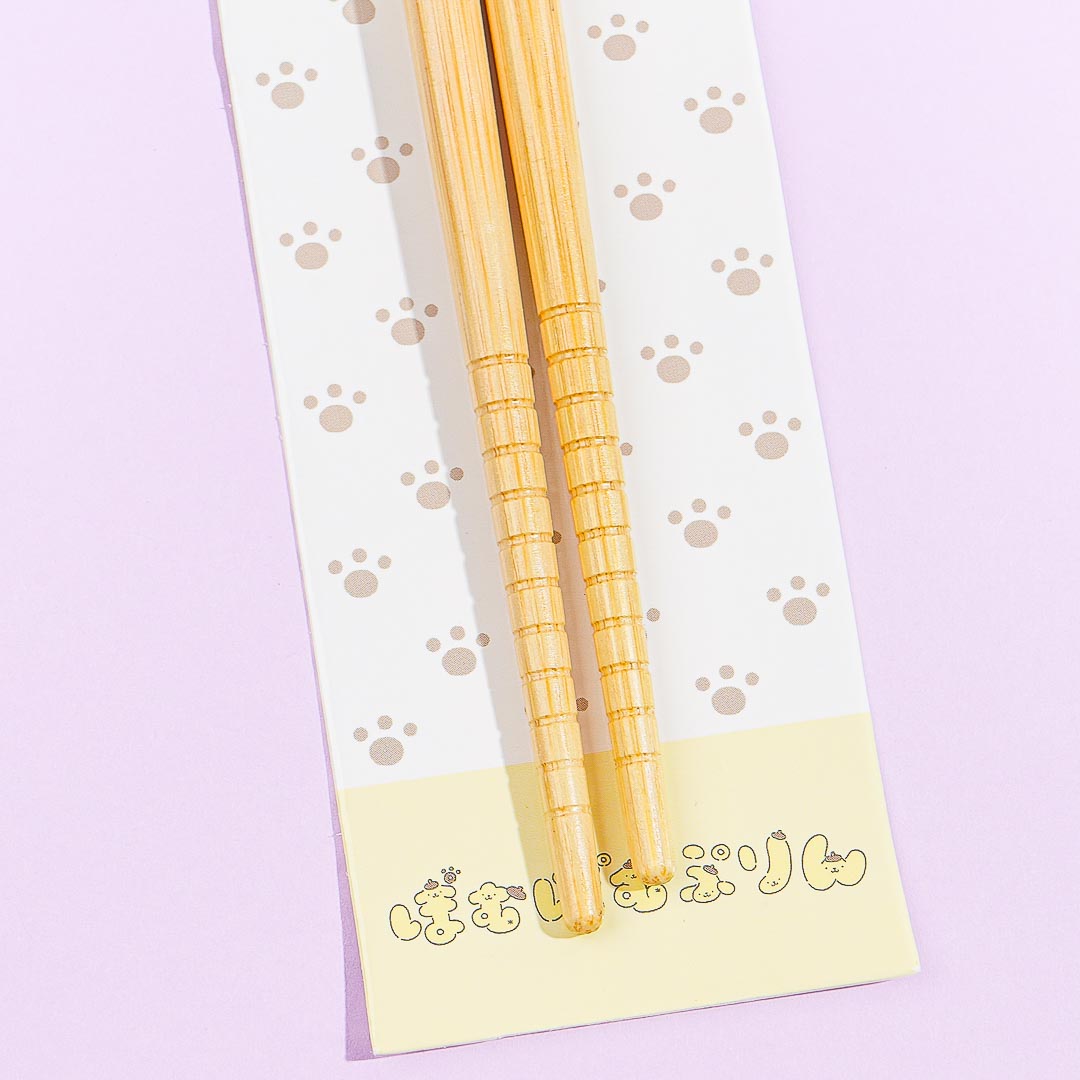 Bring this kawaii pair with your bento box to school or work! It’s made of reusable bamboo, has non-slip tips, and has cute illustrations of Pompompurin shaped into Hiragana characters that spell out his name.