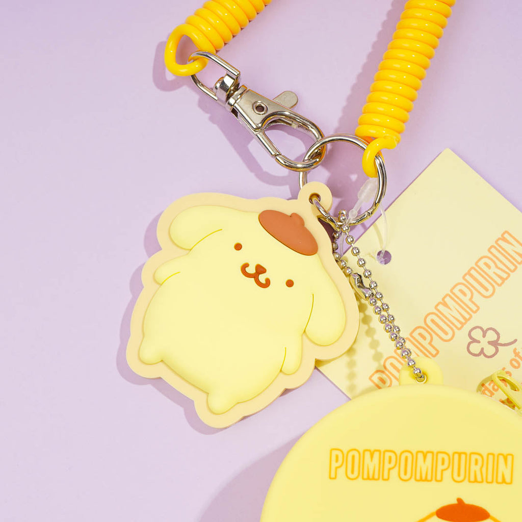 Never misplace your keys and earphones again by using this kawaii mini case! It's soft and round, featuring a print of Pompompurin and a matching rubber charm. This also comes with a noodle string that can be attached to your bag, and a metal ring for your keys.