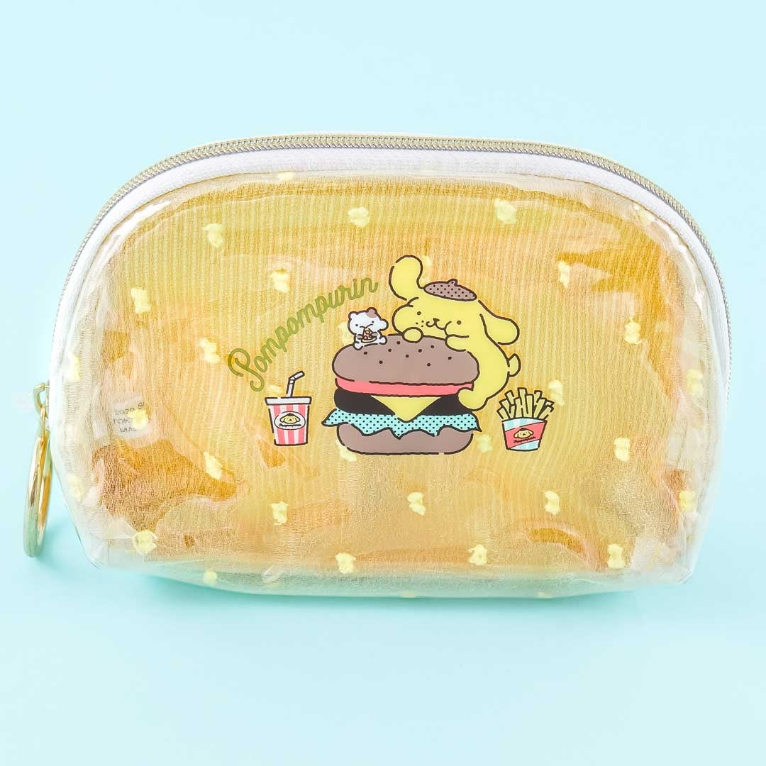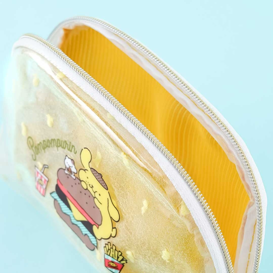 Store your makeup and other items inside this kawaii pouch covered in prints of Pompompurin trying to eat a giant hamburger! The front side of this zippered pouch is transparent with a fuzzy polka dot design. It has a wide opening so it's easy to keep your lipstick, powder, and other makeup products.