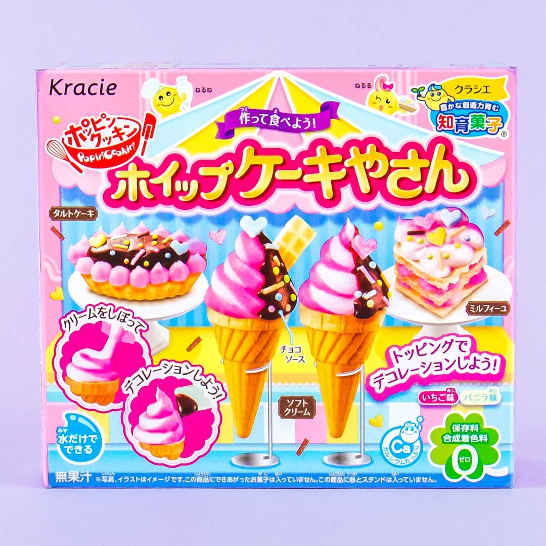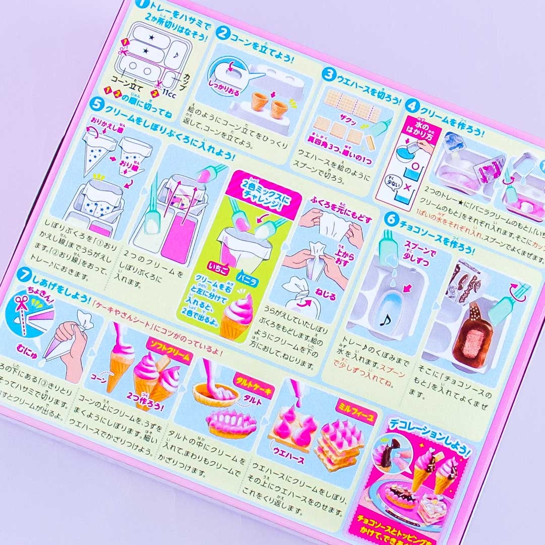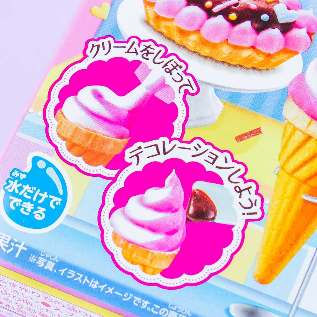 Make your own original Japanese whipped cake and other sweet treats with this DIY candy kit! Just follow the instructions and use the mold base, powder bags, spoon, and tray to make your own treats. You can make different strawberry and vanilla-flavored whipped treats like a cake tart, a wafer, and a couple of ice cream cones. Decorate your treats with chocolate sauce and cute toppings. The formula in this DIY Kit contains calcium which is great for the bones!