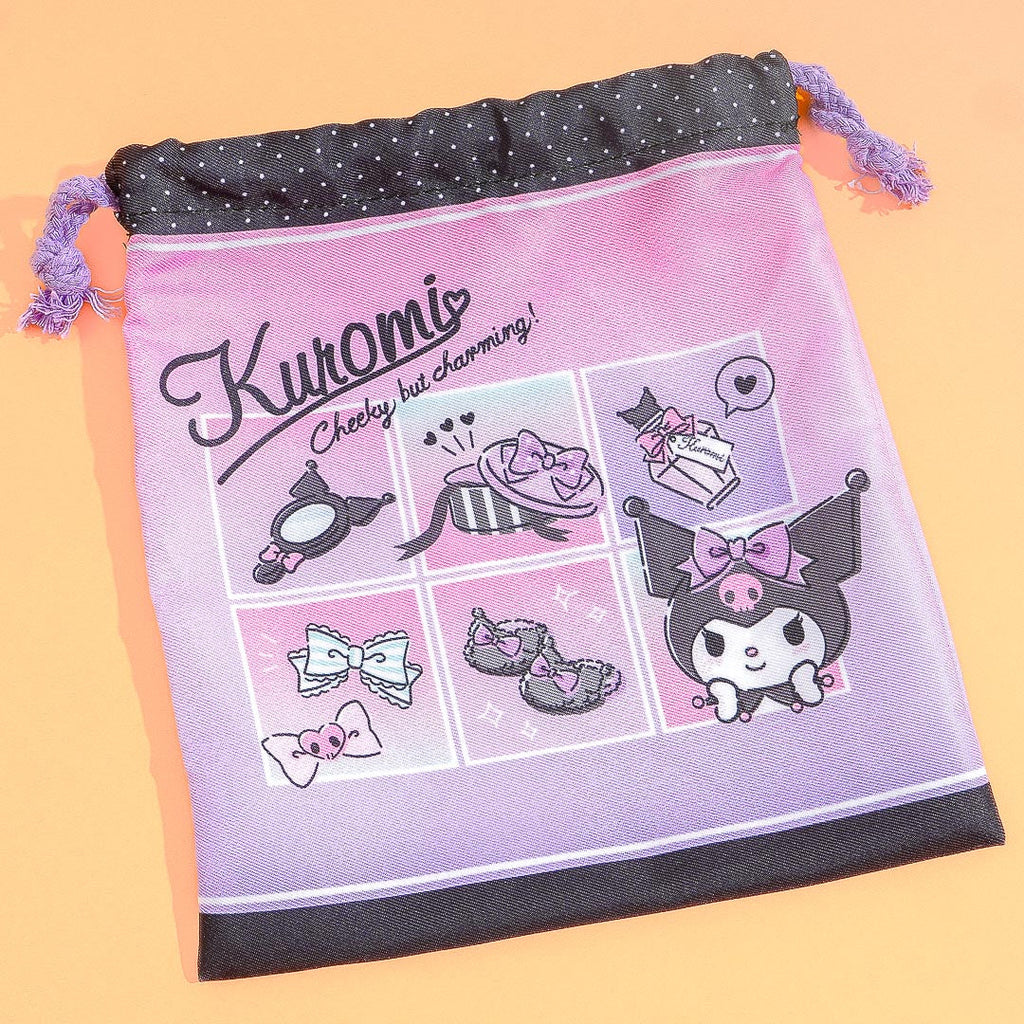This super cute drawstring bag features kawaii illustrations of Kuromi and her beauty accessories. Store your small travel essentials inside and pull the strings to close the pouch!