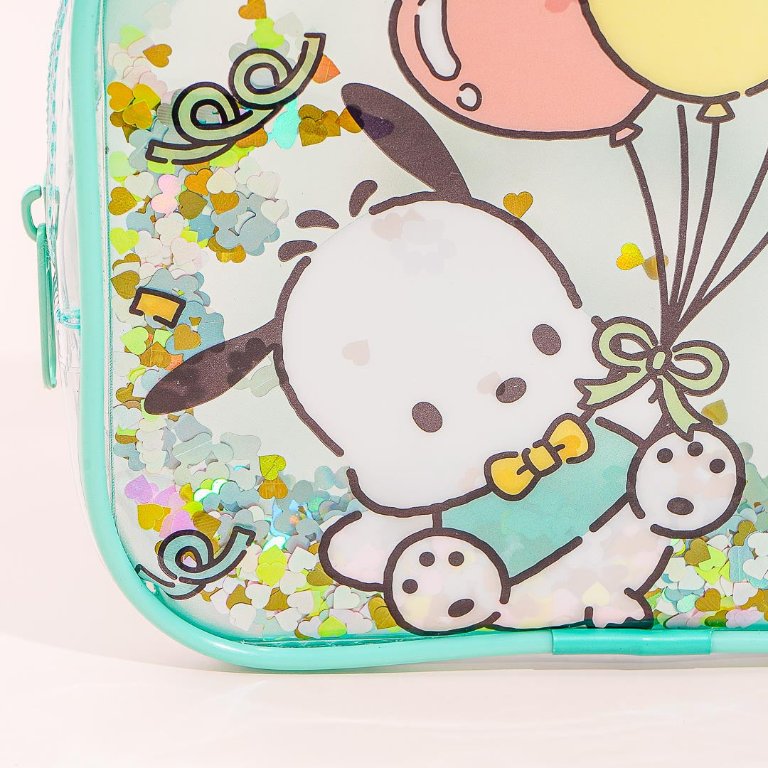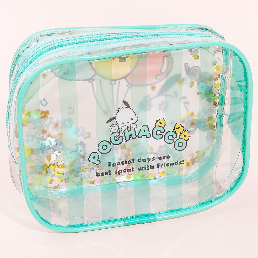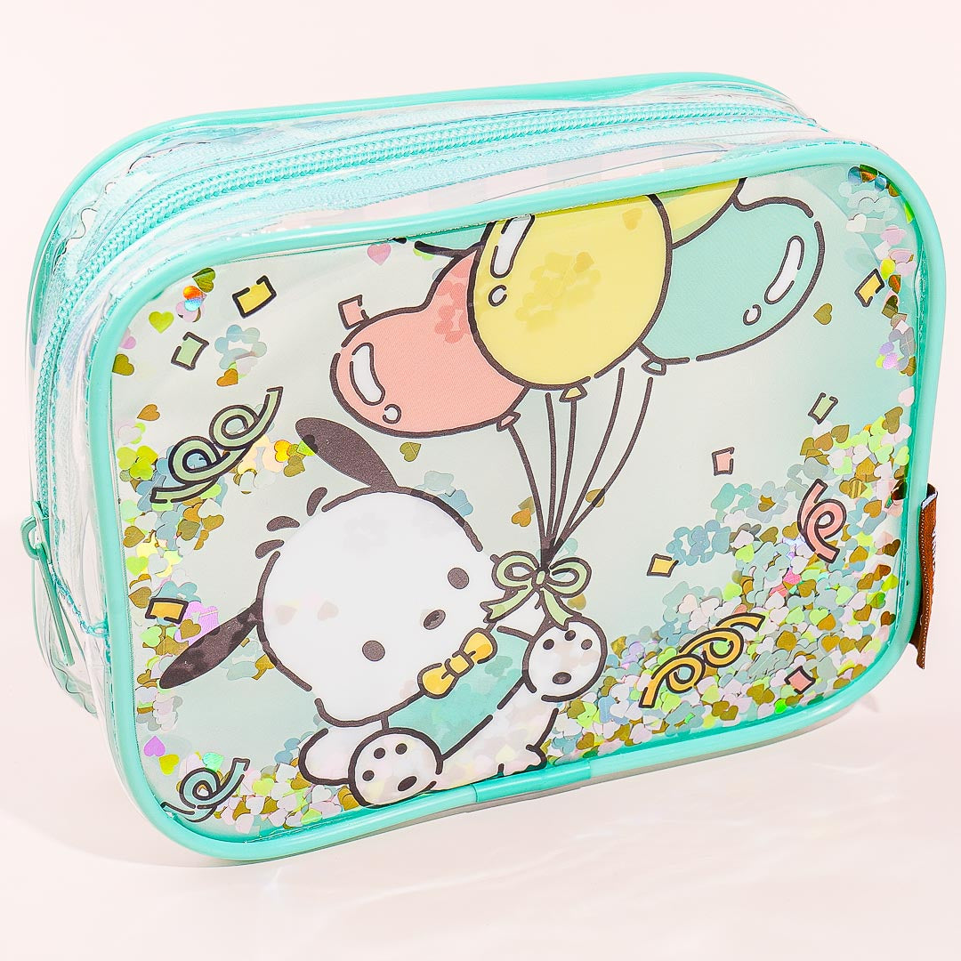 Place your favorite skin care products inside this transparent pouch! It has cute prints of Pochacco holding balloons as he celebrates his 35th anniversary and leap-year birthday! The case also has shiny glitters inside that move when you shake it.