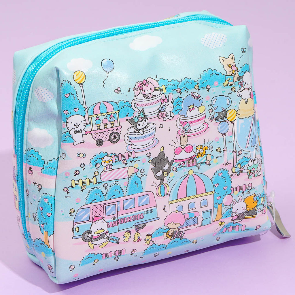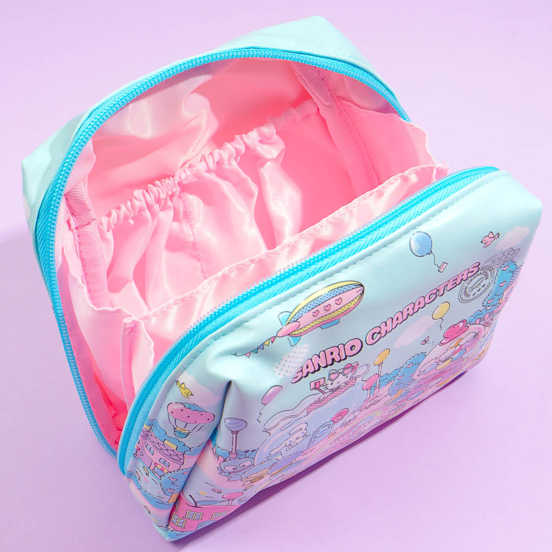 Keep your essentials organized with this kawaii pouch! It's covered in prints of Sanrio Characters on a trip to a fantasy world. This pouch opens wide for easy access and includes a divider and two pockets inside.