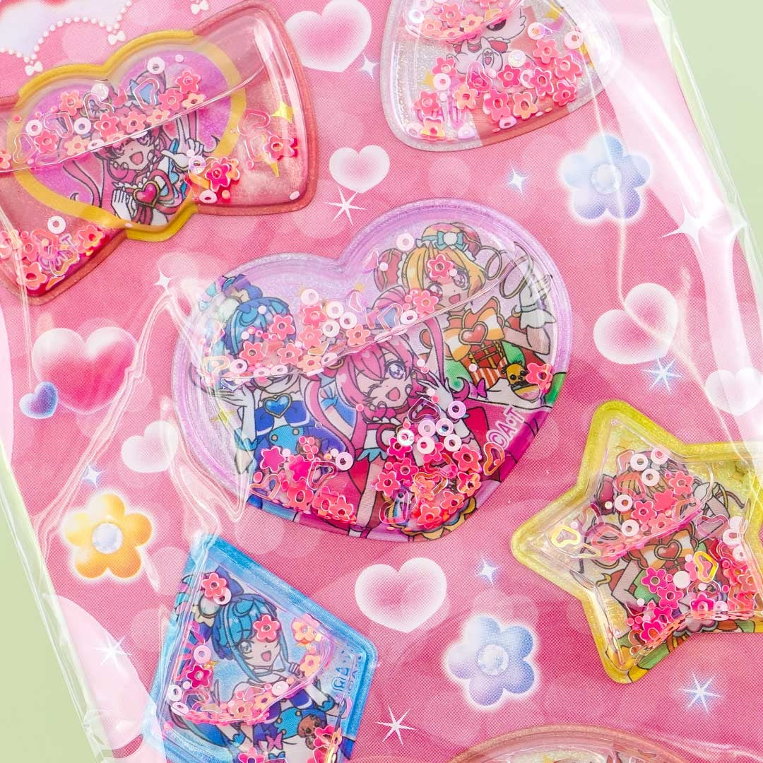 Add a touch of cuteness to your journal with this sheet of kawaii water seal stickers! They feature prints of characters from Delicious Party Pretty Cure. Each capsule sticker has water with sequins.