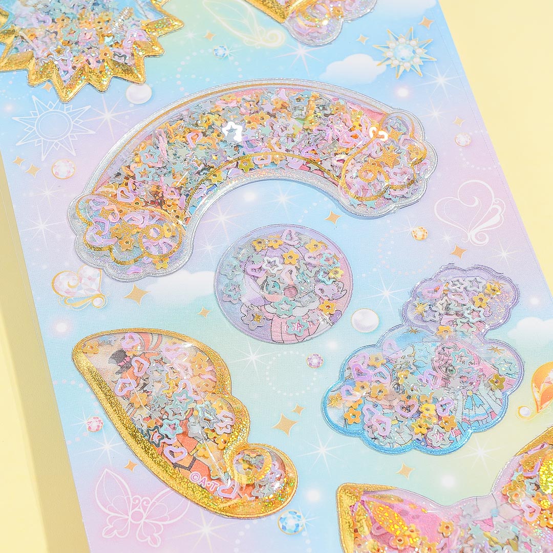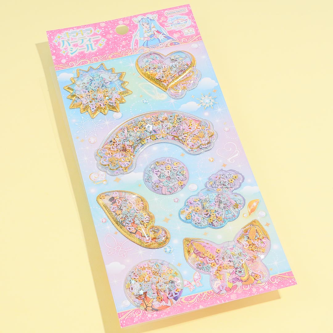 Embellish the cover of your diary with these cute water stickers. They showcase prints of Soaring Sky! Pretty cure characters! Each water sticker has glitter inside that shakes and sparkles.