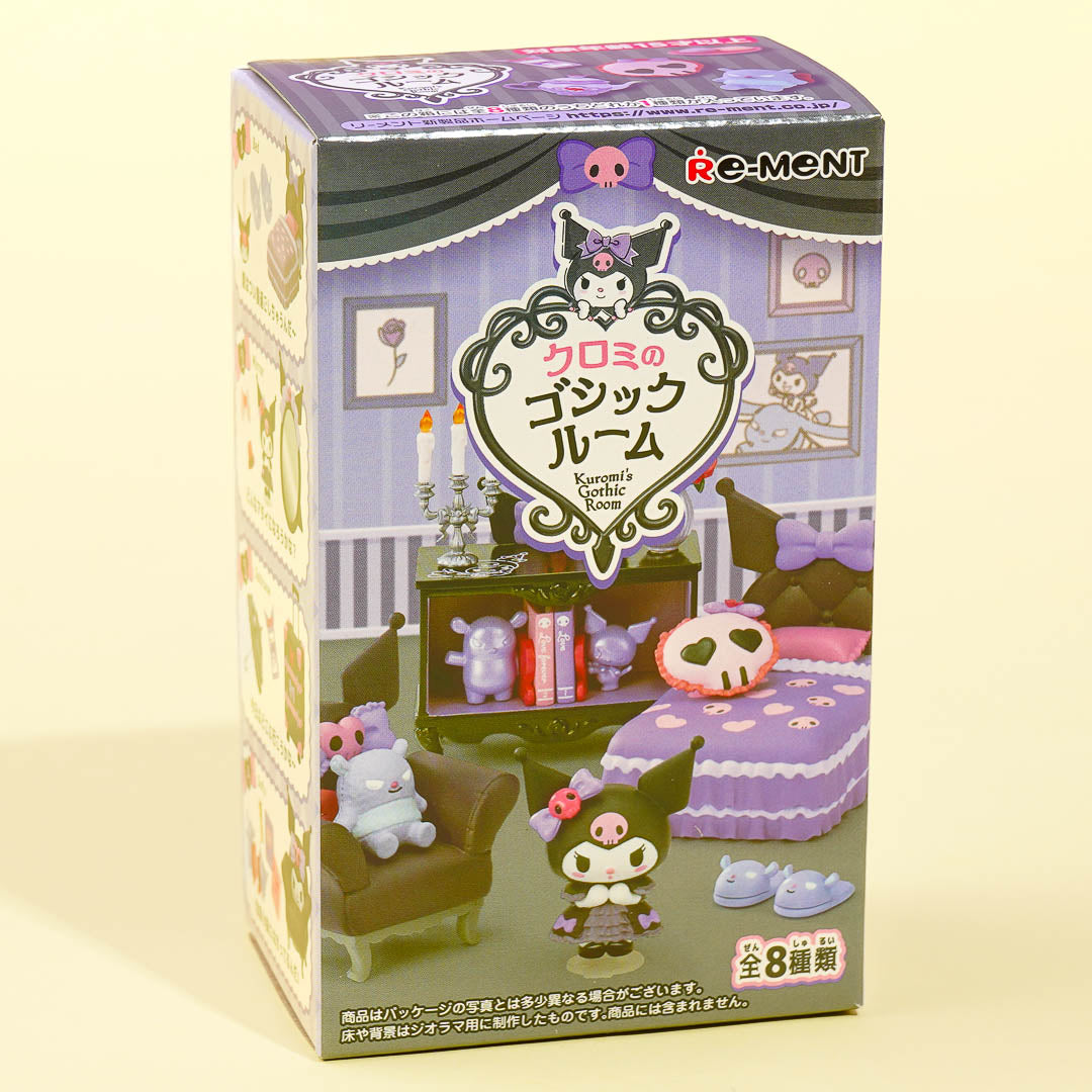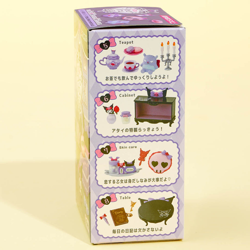 Add this gothic-themed miniature set to your toy display! It comes from the "Kuromi's Gothic Room" series of miniatures featuring bedroom items. The entire collection includes a bed set, a mirror set, a suitcase set, a sofa set, a teapot set, a cabinet set, a skincare set, and a table set. Be sure to collect all eight sets to complete Kuromi's kawaii room!