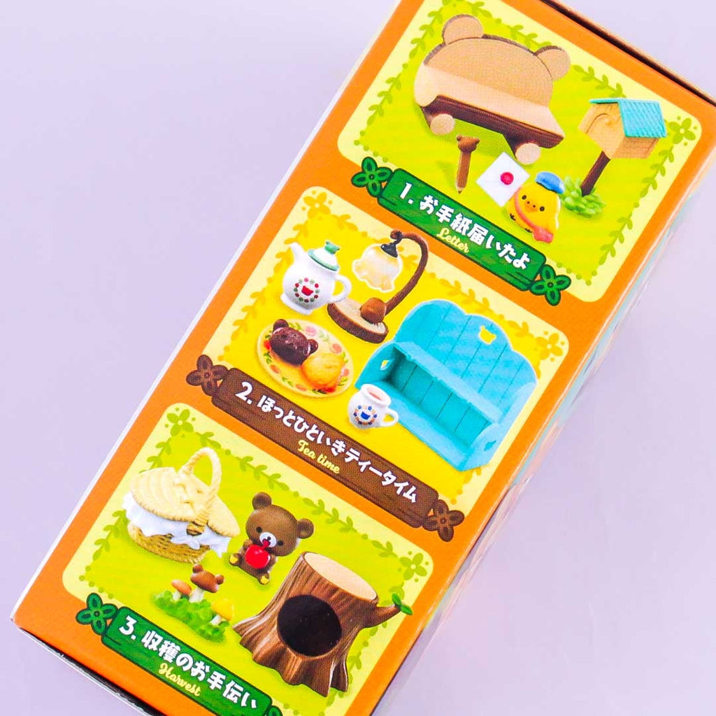 “Rilakkuma A Small Forest House” miniatures series features Rilakkuma, Chairoikoguma, Kiiroitori, and Korilakkuma living in a small wooden cabin in the forest! This kawaii series includes a wooden tea set, Kiiroitori as a mailman, Chairoikoguma harvesting, a wooden picnic table set, a tea shelf, and an apple grilling set. Each replicated item is well-detailed.