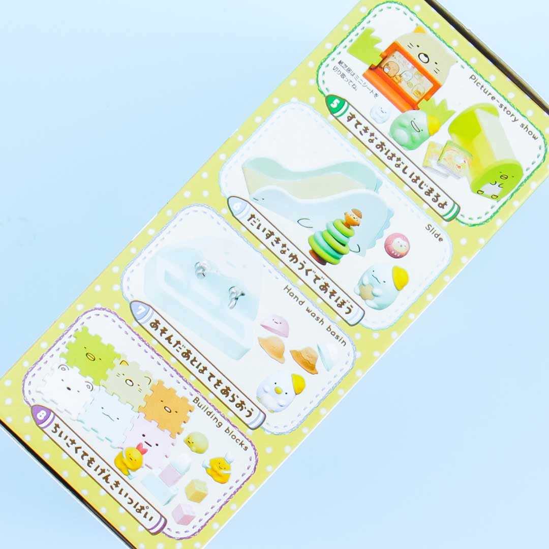 The super cute "Sumikko Gurashi Kindergarten" series features the Sumikko Gurashi gang as children playing in a kindergarten! The items in the series include miniatures of the Sumikko Gurashi characters, toys, a piano, a table set, a slide set, a puzzle mat play area, a blackboard, a sink, and school things. Each replicated mini item is highly-detailed.