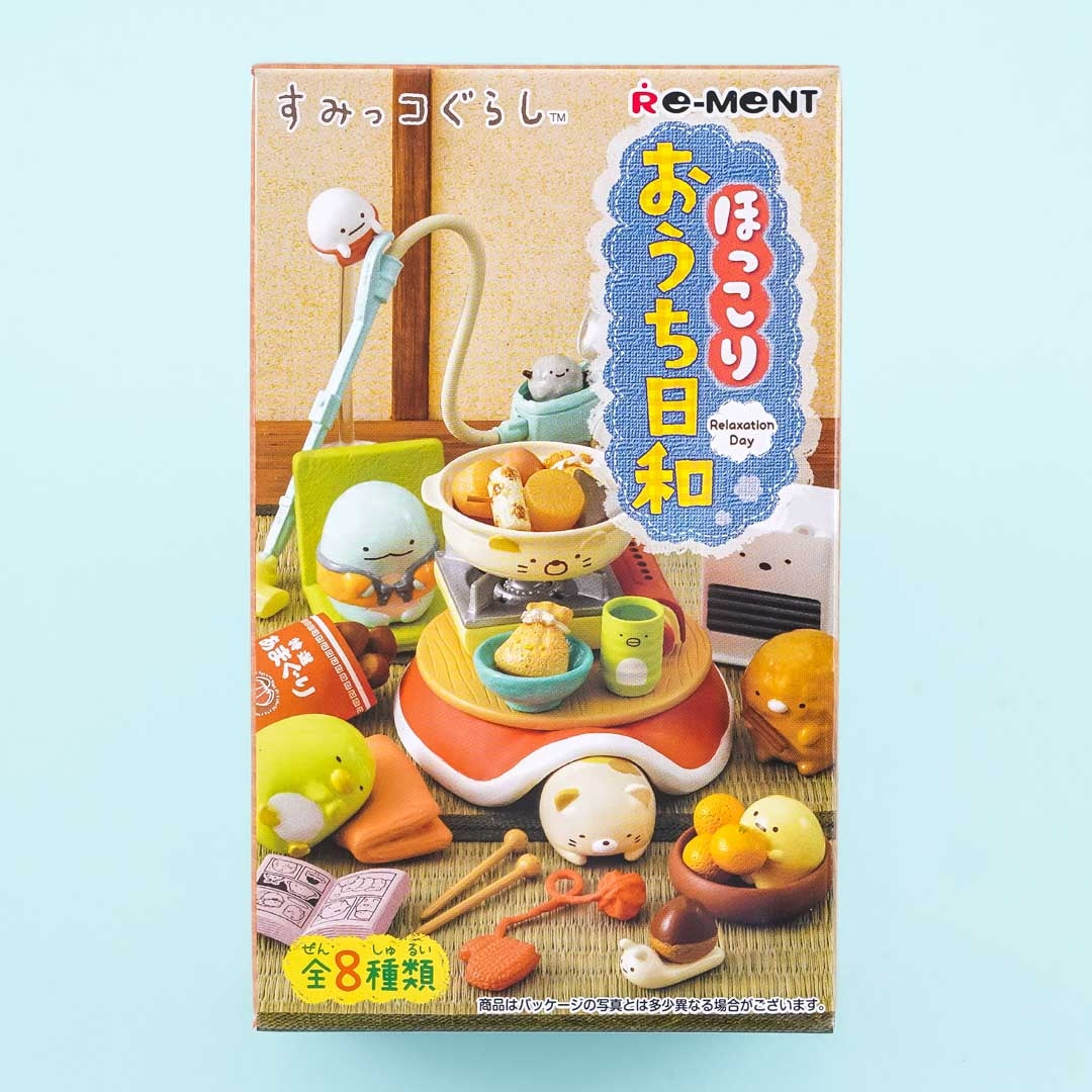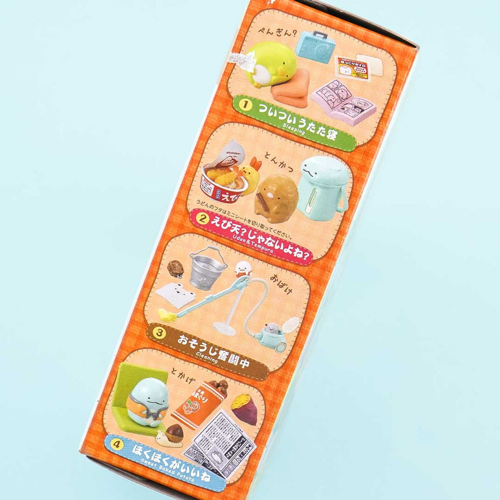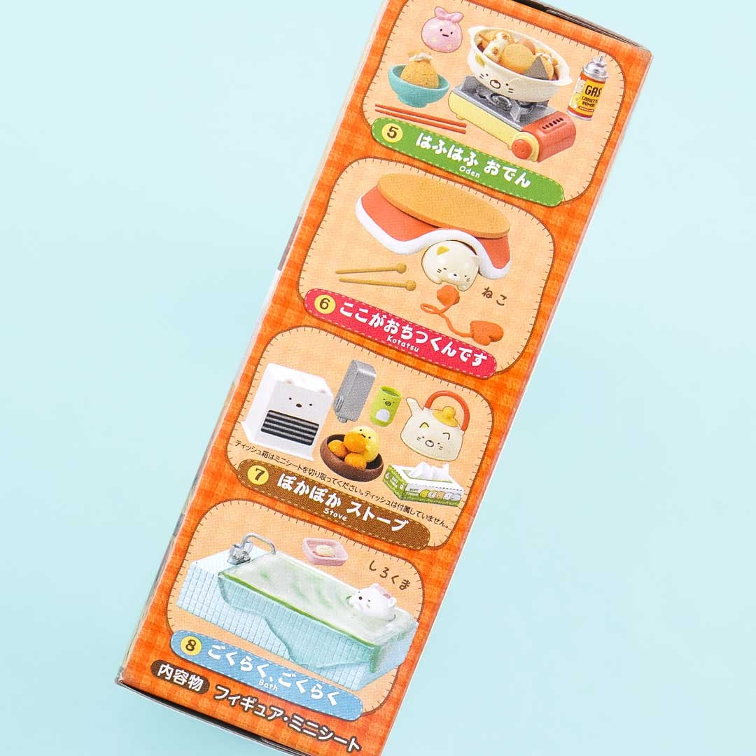 Add this super kawaii miniature to your Sumikko Gurashi collection! It comes from the "Sumikko Gurashi Relaxing Day" miniature series which features the Sumikko Gurashi gang just taking it easy at home. It includes a Sleeping set, an Udon & Tempura set, a Cleaning set, a Sweet Baked Potato set, an Oden set, a Kotatsu set, a Stove set, and a Bath Set. Each replicated mini item is highly detailed.