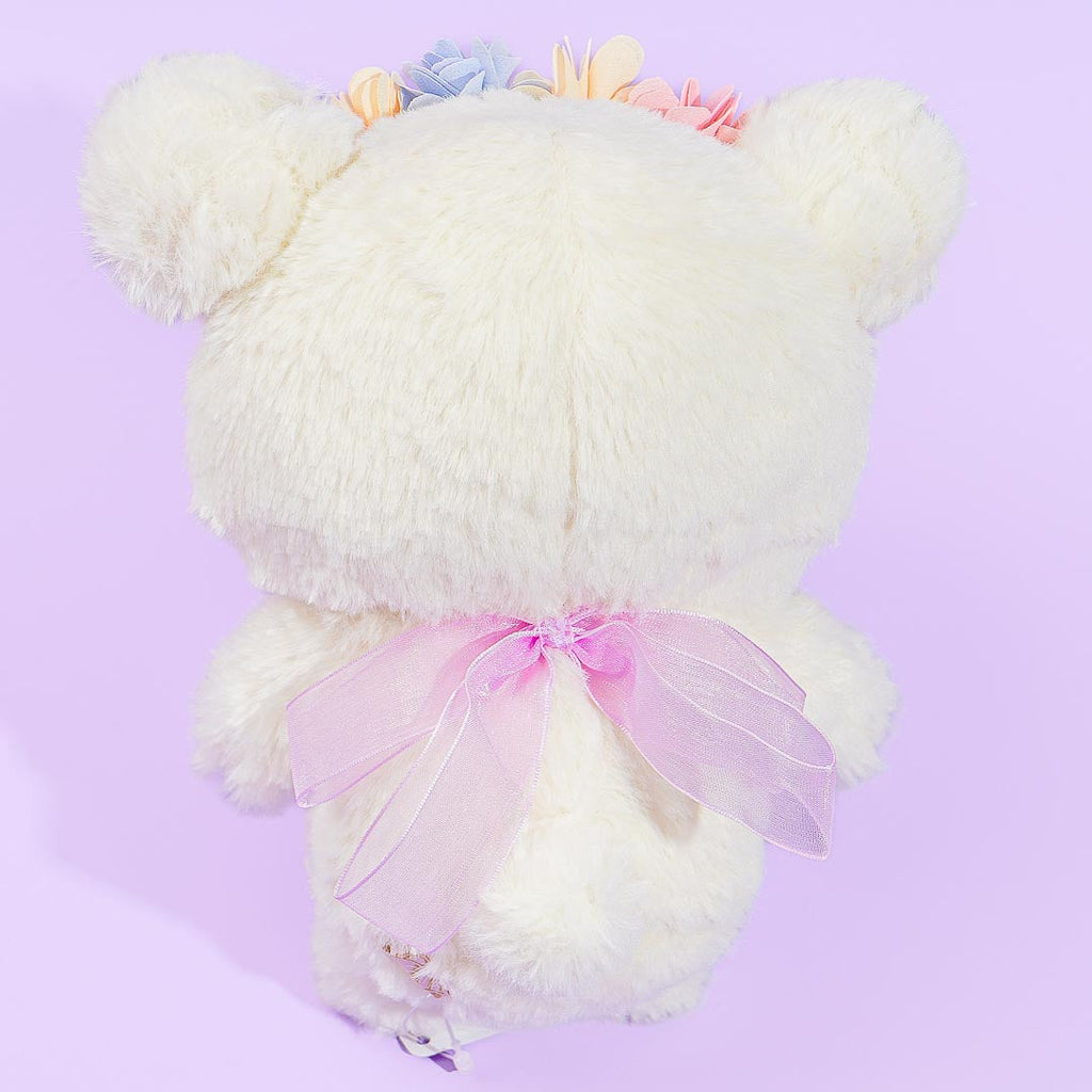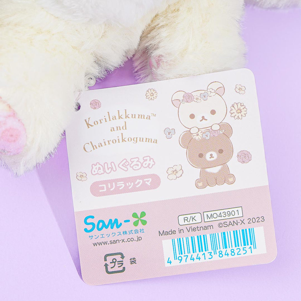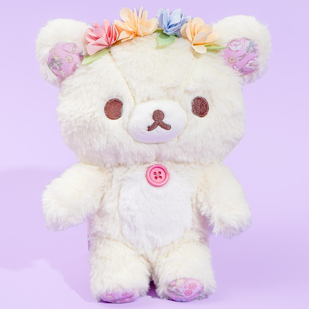 This kawaii Korilakkuma plushie looks so sweet with its flower crown and cute button. It even has floral-patterned ears and paws for added cuteness! Make this medium-sized plushie your newest snuggle buddy!'