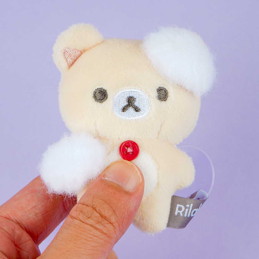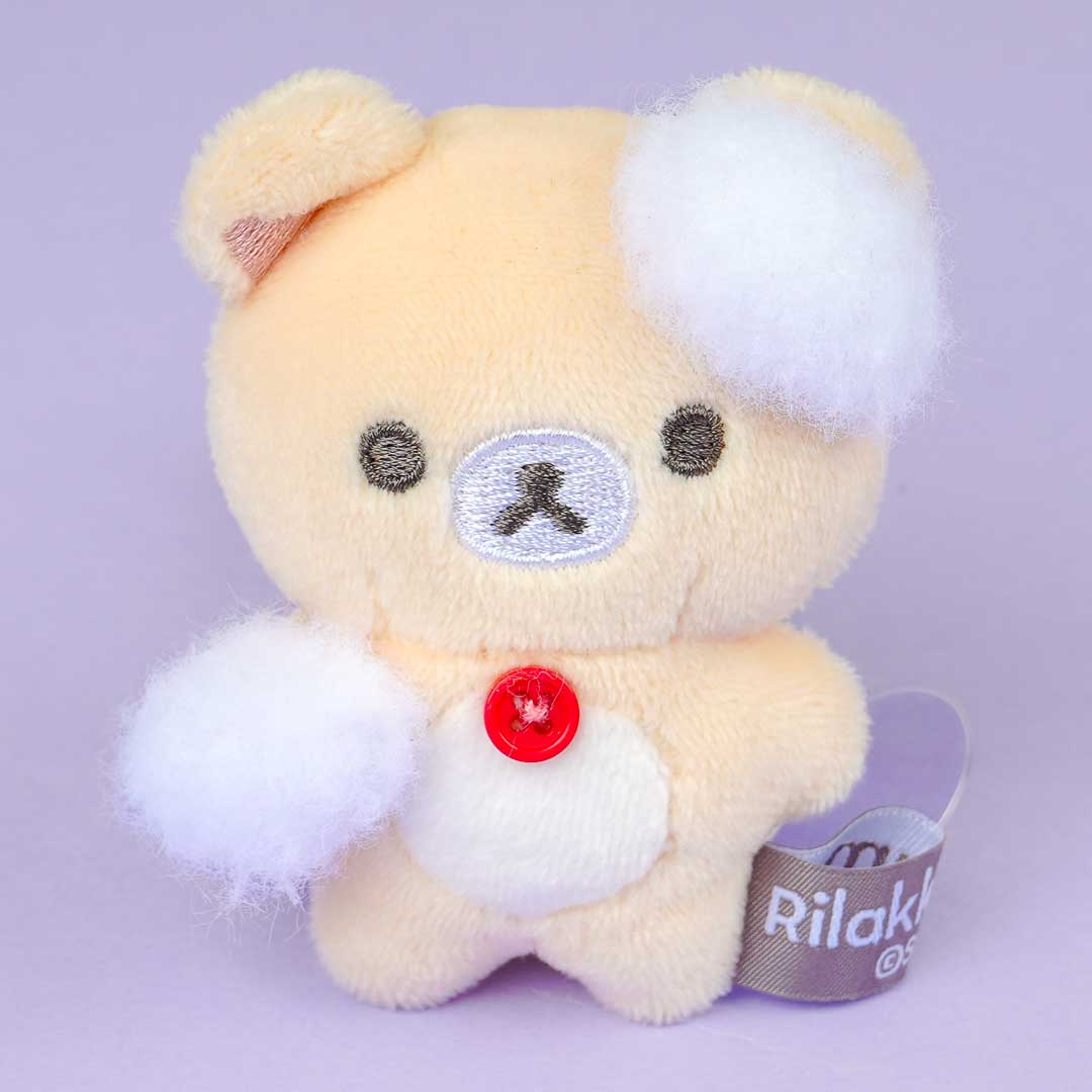 This mini kawaii Korilakkuma plushie is wearing white fluffy accessories! It stands on its own so you can use it as a desk decoration.