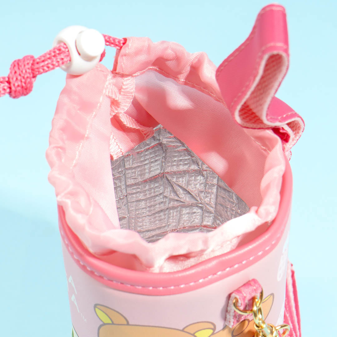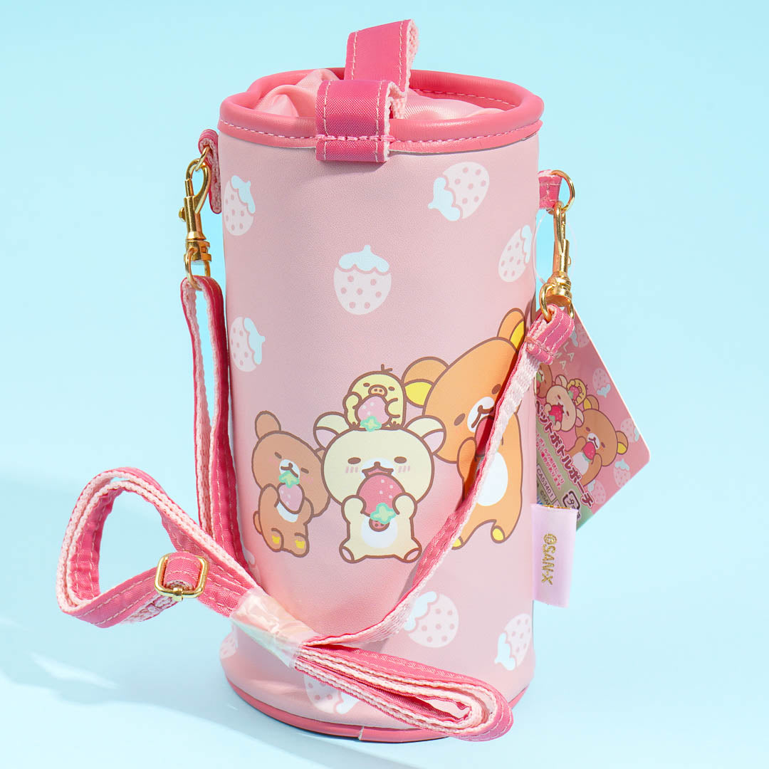 Carry your water bottle kawaii style with this super cute bottle cover featuring Korilakkuma and friends enjoying strawberries! It also showcases a drawstring closure, a removable and adjustable shoulder strap, a hand strap, and an inner aluminum lining to keep your drink cool.