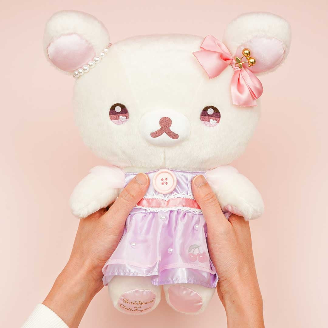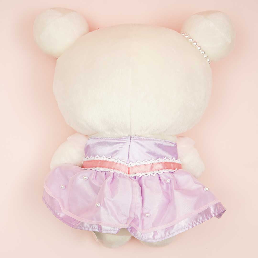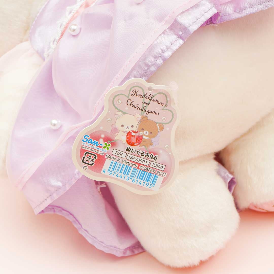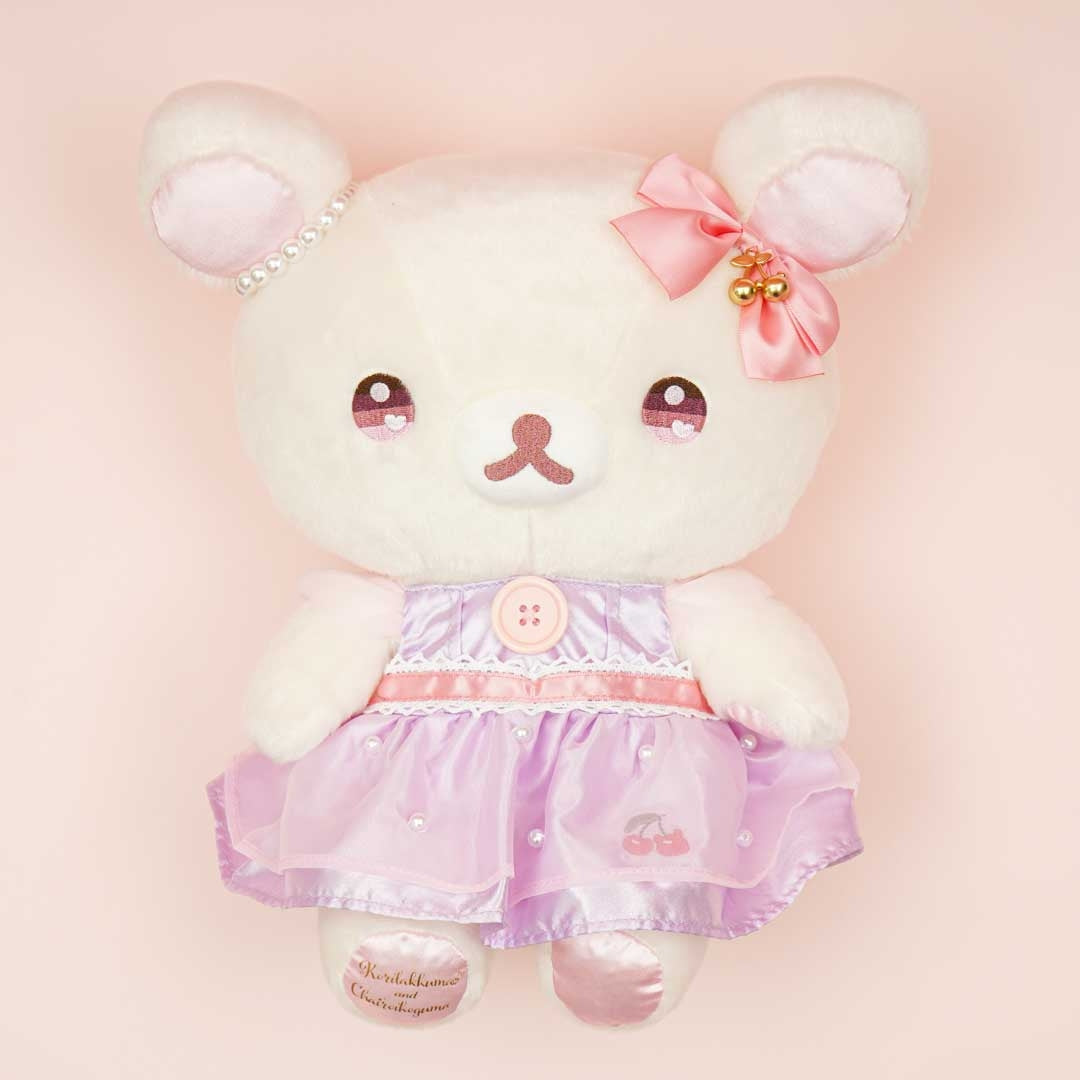 Have fun playing princess with this super cute Korilakkuma plushie! This medium-sized cutie is wearing a fancy satin dress embellished with pearl beads and a cherry print.