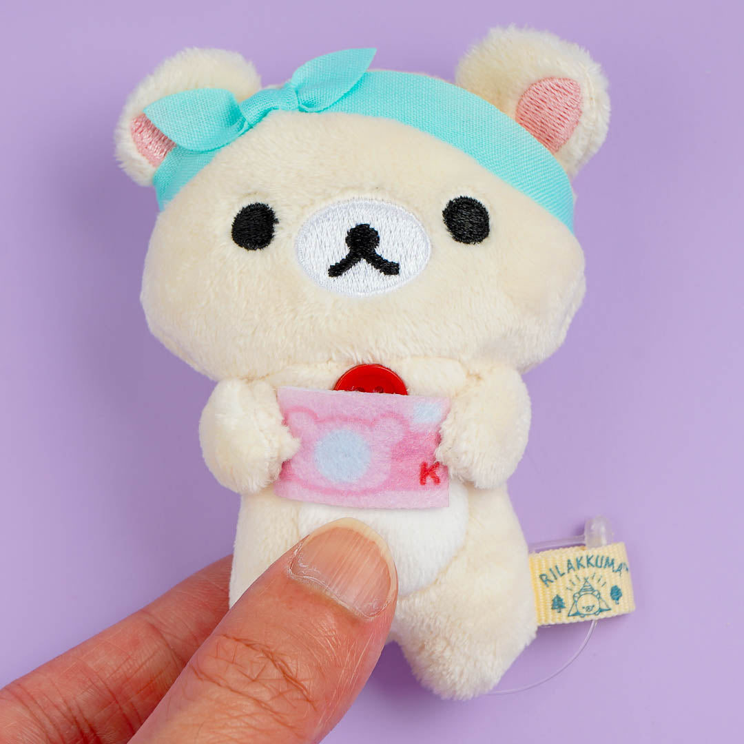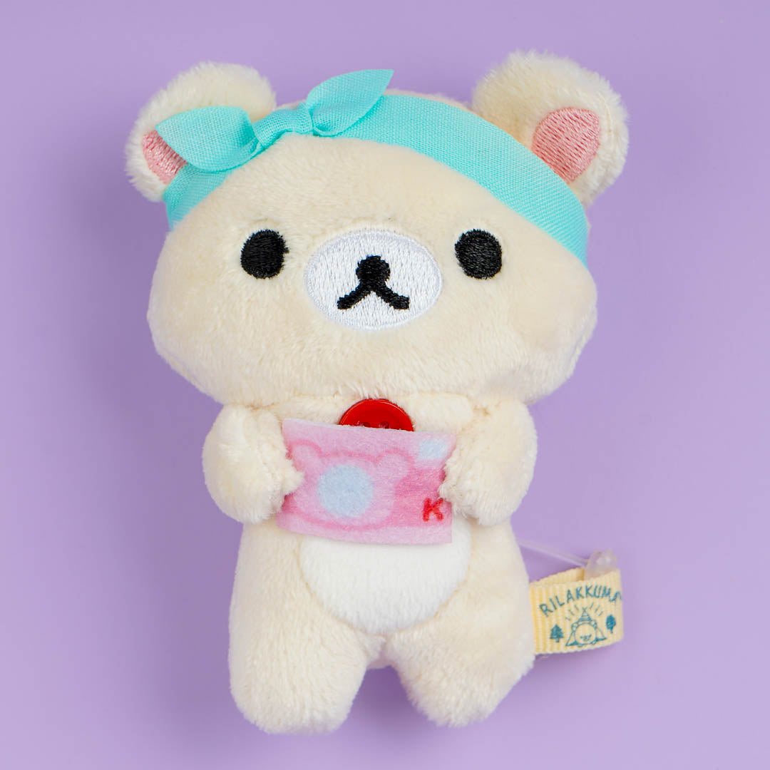 Korilakkuma looks super cute and ready for a summer camping trip! This soft and fluffy mini plushie is wearing a bow headband and is holding a 2D camera. Have fun playing with this cute stuffed toy!