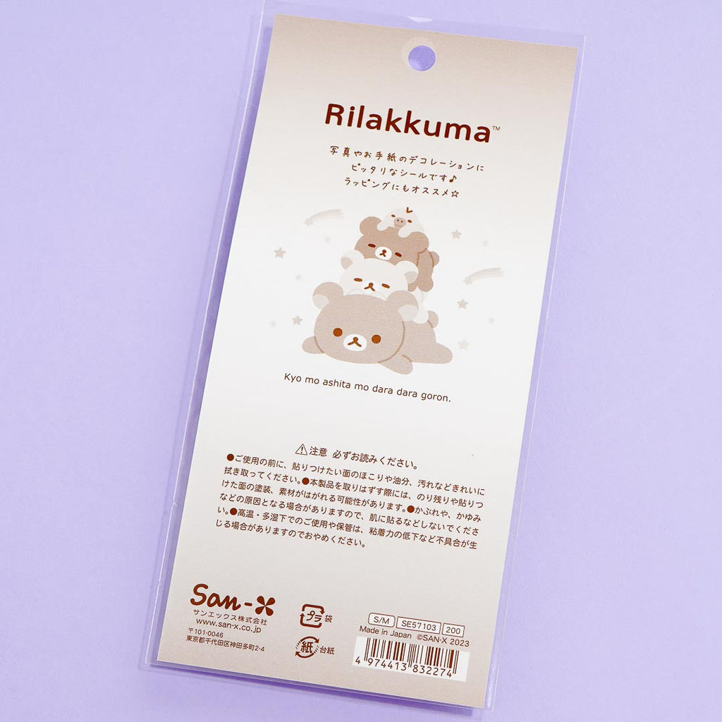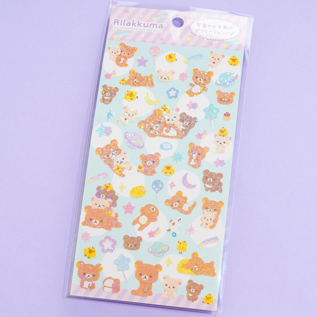 Decorate your plain stuff with this sticker sheet! It features Rilakkuma relaxing and playing with friends. It also includes glittery heavenly bodies to give intergalactic vibes to your photos and letters!