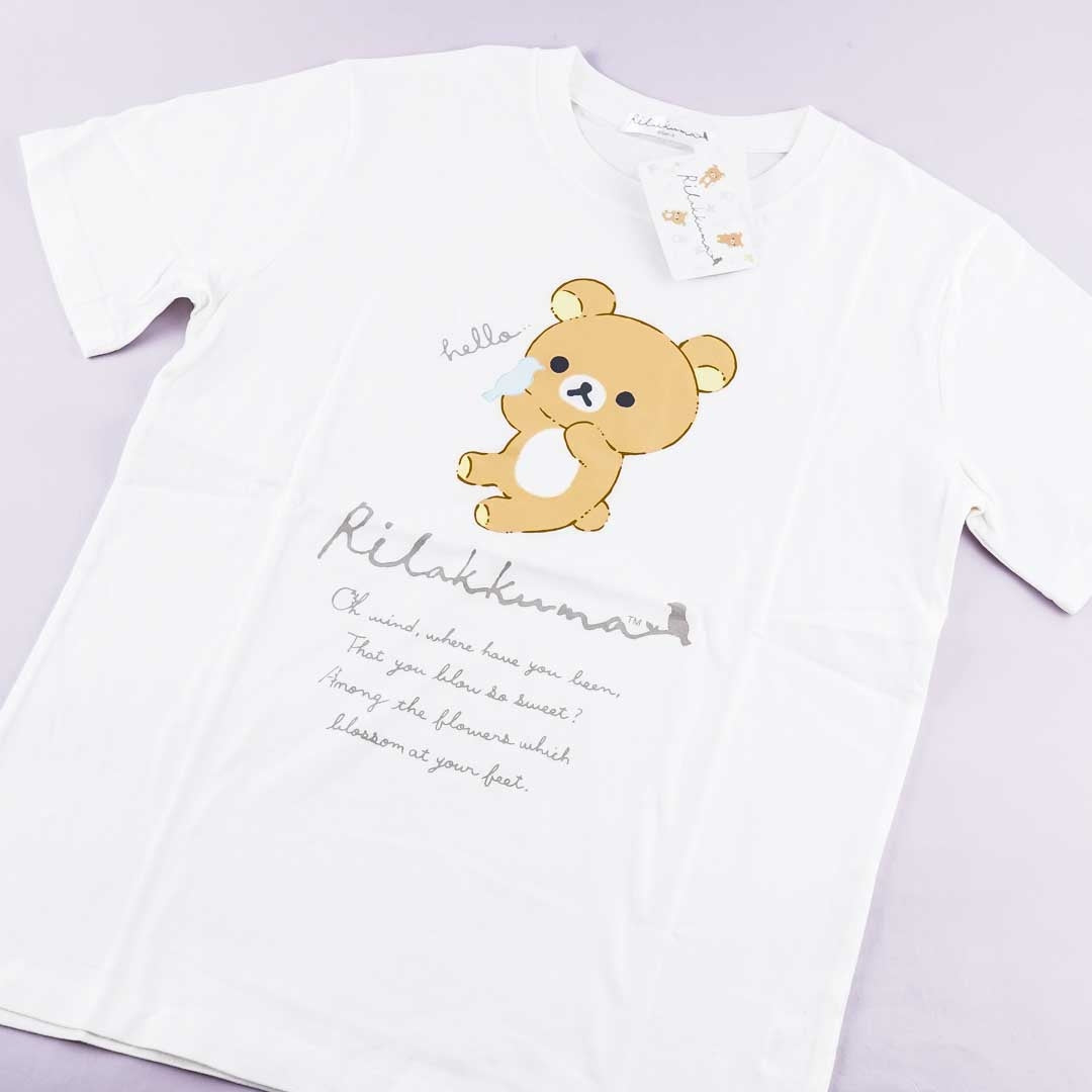 Wear this super cute white t-shirt with an illustration of Rilakkuma and a poem! This very comfortable shirt is made of 100% cotton material and fits best for small sizes.