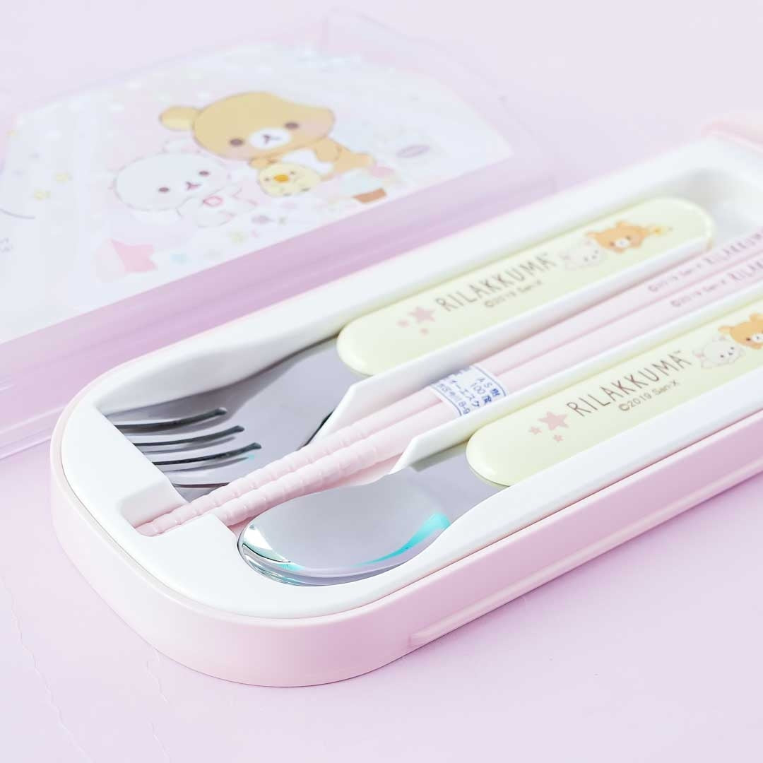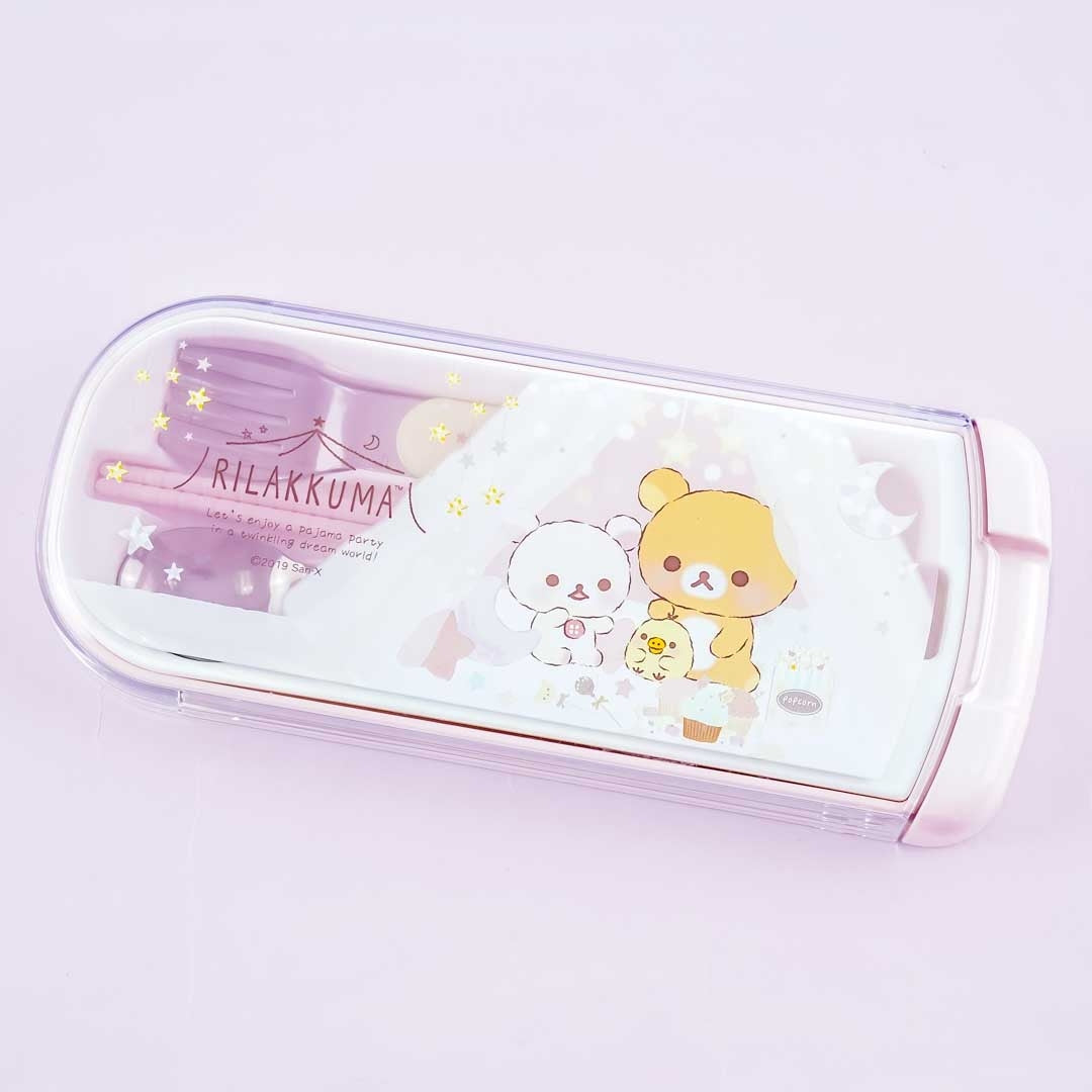 • A super kawaii utensil set featuring prints of Rilakkuma and his friends having a sleepover